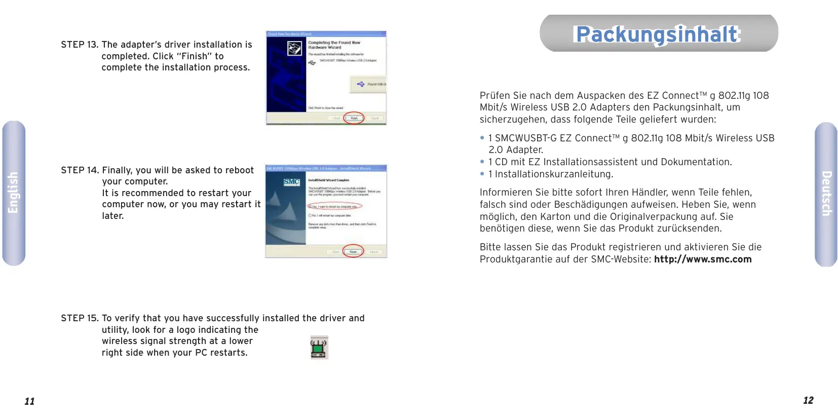 - 1 Installationskurzanleitung. Informieren Sie bitte sofort Ihren Händler, wenn Teile fehlen, falsch sind oder Beschädigungen aufweisen. Heben Sie, wenn möglich, den Karton und die Originalverpackung auf. Sie benötigen diese, wenn Sie das Produkt zurücksenden. Bitte lassen Sie das Produkt registrieren und aktivieren Sie die Produktgarantie auf der SMC-Website: http://www.smc.com STEP 15. To verify that you have successfully installed the driver and utility, look for a logo indicating the wireless signal strength at a lower right side when your PC restarts.