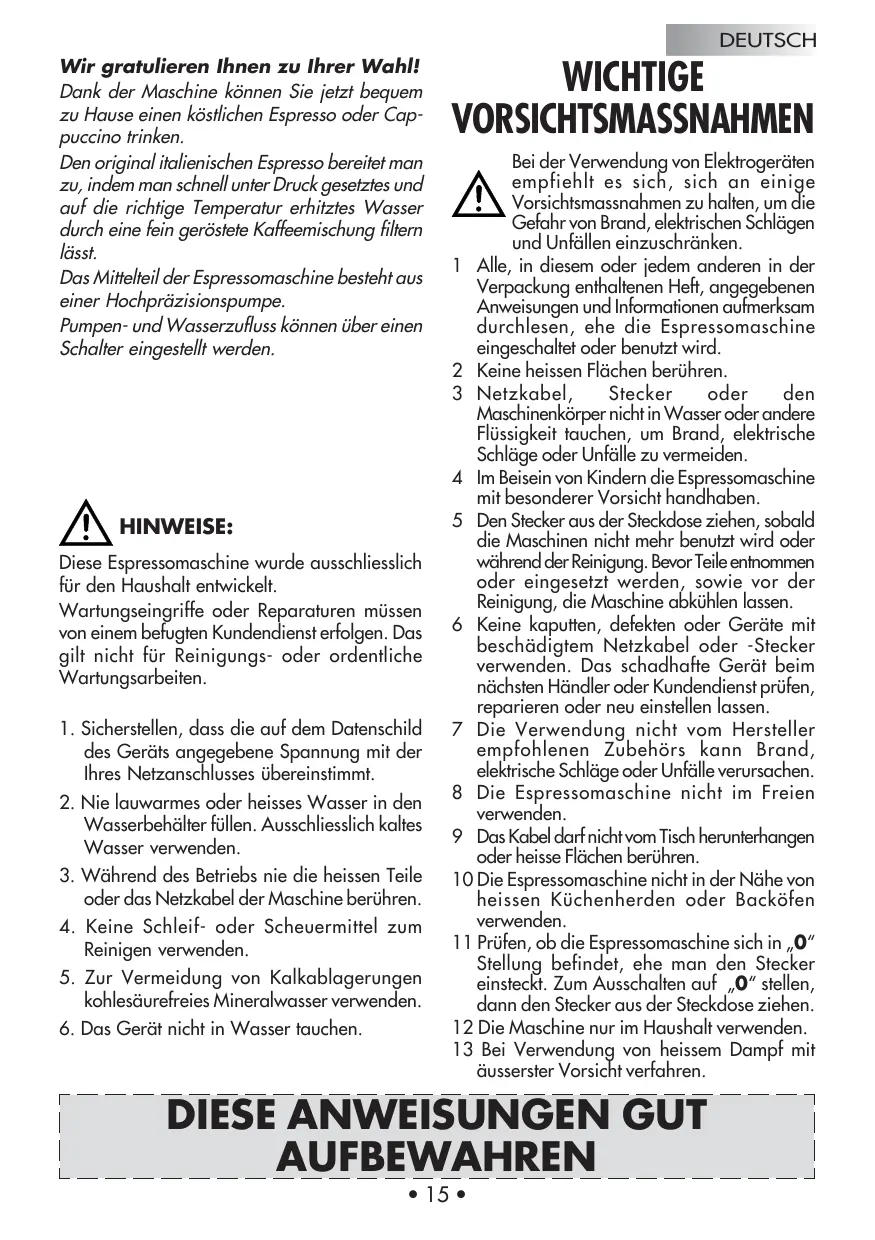 - 14 • DEUTSCH Wir gratulieren Ihnen zu Ihrer Wahl! Dank der Maschine können Sie jetzt bequem zu Hause einen köstlichen Espresso oder Cappuccino trinken. Den original italienischen Espresso bereitet man zu, indem man schnell unter Druck gesetztes und auf die richtige Temperatur erhitztes Wasser durch eine fein geröstete Kaffeemischung filtern lässt. Das Mittelteil der Espressomaschine besteht aus einer Hochpräzisionspumpe. Pumpen- und Wasserzufluss können über einen Schalter eingestellt werden. HINWEISE: Diese Espressomaschine wurde ausschliesslich für den Haushalt entwickelt. Wartungseingriffe oder Reparaturen müssen von einem befugten Kundendienst erfolgen. Das gilt nicht für Reinigungs- oder ordentliche Wartungsarbeiten.