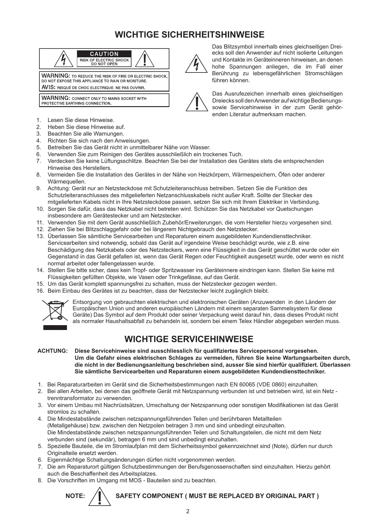 Das Ausrufezeichen innerhalb eines gleichseitigen Dreiecks soll den Anwender auf wichtige Bedienungssowie Servicehinweise in der zum Gerät gehörenden Literatur aufmerksam machen. Lesen Sie diese Hinweise. Heben Sie diese Hinweise auf. Beachten Sie alle Warnungen. Richten Sie sich nach den Anweisungen. Betreiben Sie das Gerät nicht in unmittelbarer Nähe von Wasser. Verwenden Sie zum Reinigen des Gerätes ausschließlich ein trockenes Tuch. Verdecken Sie keine Lüftungsschlitze. Beachten Sie bei der Installation des Gerätes stets die entsprechenden Hinweise des Herstellers. Vermeiden Sie die Installation des Gerätes in der Nähe von Heizkörpern, Wärmespeichern, Öfen oder anderer Wärmequellen. Achtung: Gerät nur an Netzsteckdose mit Schutzleiteranschluss betreiben. Setzen Sie die Funktion des Schutzleiteranschlusses des mitgelieferten Netzanschlusskabels nicht außer Kraft. Sollte der Stecker des mitgelieferten Kabels nicht in Ihre Netzsteckdose passen, setzen Sie sich mit Ihrem Elektriker in Verbindung. Sorgen Sie dafür, dass das Netzkabel nicht betreten wird. Schützen Sie das Netzkabel vor Quetschungen insbesondere am Gerätestecker und am Netzstecker. Verwenden Sie mit dem Gerät ausschließlich Zubehör/Erweiterungen, die vom Hersteller hierzu vorgesehen sind. Ziehen Sie bei Blitzschlaggefahr oder bei längerem Nichtgebrauch den Netzstecker. Überlassen Sie sämtliche Servicearbeiten und Reparaturen einem ausgebildeten Kundendiensttechniker. Servicearbeiten sind notwendig, sobald das Gerät auf irgendeine Weise beschädigt wurde, wie z.B. eine Beschädigung des Netzkabels oder des Netzsteckers, wenn eine Flüssigkeit in das Gerät geschüttet wurde oder ein Gegenstand in das Gerät gefallen ist, wenn das Gerät Regen oder Feuchtigkeit ausgesetzt wurde, oder wenn es nicht normal arbeitet oder fallengelassen wurde. Stellen Sie bitte sicher, dass kein Tropf- oder Spritzwasser ins Geräteinnere eindringen kann. Stellen Sie keine mit Flüssigkeiten gefüllten Objekte, wie Vasen oder Trinkgefässe, auf das Gerät. Um das Gerät komplett spannungsfrei zu schalten, muss der Netzstecker gezogen werden. Beim Einbau des Gerätes ist zu beachten, dass der Netzstecker leicht zugänglich bleibt. Entsorgung von gebrauchten elektrischen und elektronischen Geräten (Anzuwenden in den Ländern der Europäischen Union und anderen europäischen Ländern mit einem separaten Sammelsystem für diese Geräte) Das Symbol auf dem Produkt oder seiner Verpackung weist darauf hin, dass dieses Produkt nicht als normaler Haushaltsabfall zu behandeln ist, sondern bei einem Telex Händler abgegeben werden muss. WICHTIGE SERVICEHINWEISE ACHTUNG: Diese Servicehinweise sind ausschliesslich für qualifiziertes Servicepersonal vorgesehen. Um die Gefahr eines elektrischen Schlages zu vermeiden, führen Sie keine Wartungsarbeiten durch, die nicht in der Bedienungsanleitung beschrieben sind, ausser Sie sind hierfür qualifiziert. Überlassen Sie sämtliche Servicearbeiten und Reparaturen einem ausgebildeten Kundendiensttechniker.