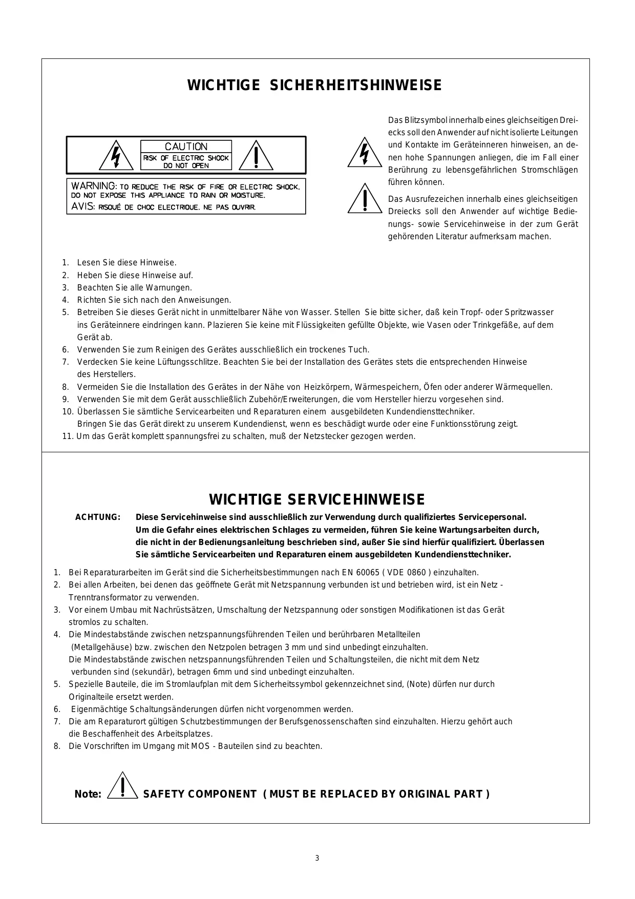 ACHTUNG: These Servicehinweise sind ausschließlich zur Verwendung durch qualifiziertes Servicepersonal. Um die Gefahr eines elektrischen Schlages zu vermeiden, führen Sie keine Wartungsarbeiten durch, die nicht in der Bedienungsanleitung beschrieben sind, außer Sie sind hierfür qualifiziert. Überlassen Sie sãmtliche Servicearbeiten und Reparaturen einem ausgebildeten Kundendiensttechniker.
