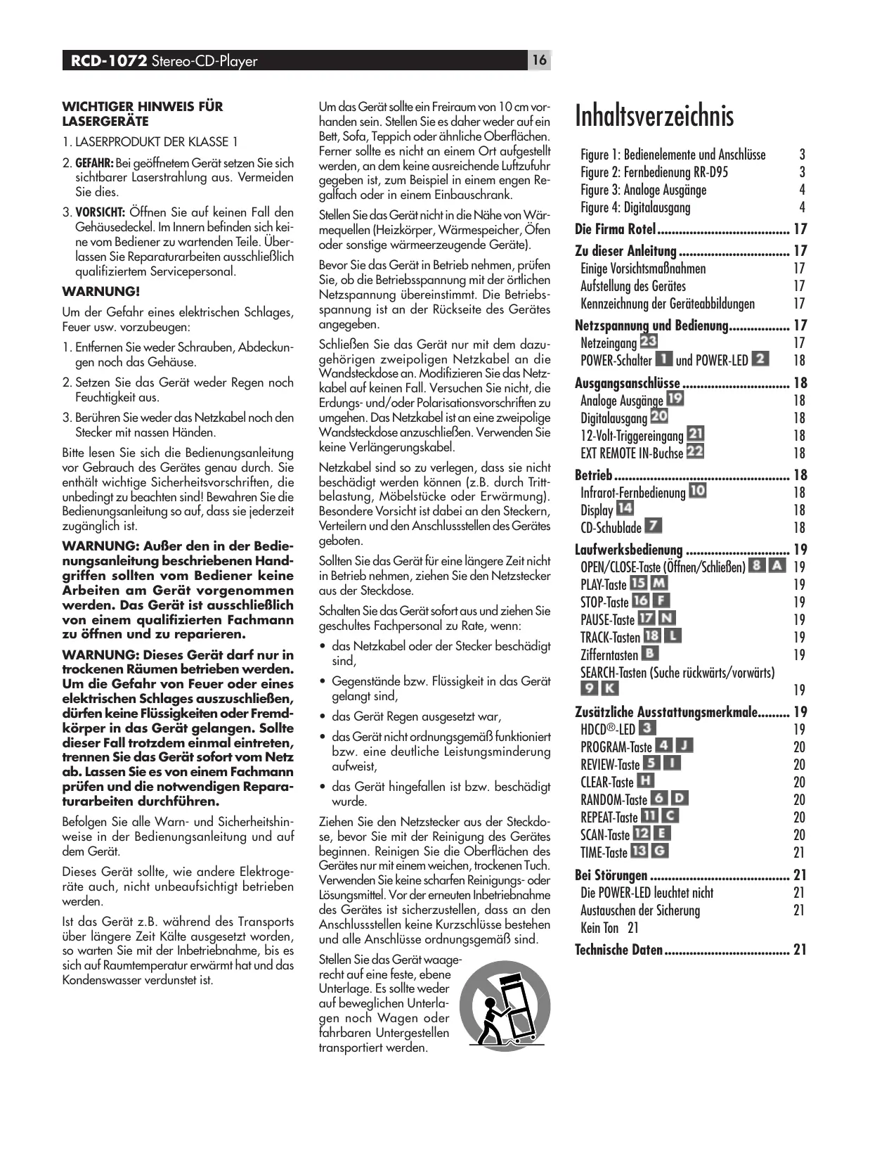 Stecker mit nassen Händen. Bitte lesen Sie sich die Bedienungsanleitung vor Gebrauch des Gerätes genau durch. Sie enthält wichtige Sicherheitsvorschriften, die unbedingt zu beachten sind! Bewahren Sie die Bedienungsanleitung so auf, dass sie jederzeit zugänglich ist. WARNUNG: AuBer den in der Bedie- nungsanleitung beschriebenen Hand- griffen sollten vom Bediener keine Arbeiten am Gerät vorgenommen werden. Das Gerät ist ausschlieBlich von einem qualifizierten Fachmann zu ëffnen und zu reparieren. WARNUNG: Dieses Gerät darf nur in trockenen Räumen betrieben werden. Um die Gefahr von Feuer oder eines elektrischen Schlages auszuschlieBen, dürfen keine Flüssigkeiten oder Fremd- kërper in das Gerät gelangen. Sollte dieser Fall trotzdem einmal eintreten, trennen Sie das Gerët sofort vom Netz ab. Lassen Sie es von einem Fachmann prüfen und die notwendigen Repara- turarbeiten durchführen. Befolgen Sie alle Warn- und Sicherheitshin- weise in der Bedienungsanleitung und auf dem Geräit. Dieses Gerät sollte, wie andere Elektroge- räte auch, nicht unbeaufsichtigt betrieben werden. Ist das Gerät z.B. während des Transports über längere Zeit Kälte ausgesetzt worden, so warten Sie mit der Inbetriebnahme, bis es sich auf Raumtemperatur erwärmt hat und das Kondenswasser verdunstet ist. Um das Gerëit sole ein Freiraum von 10 em vor- handen sein. Stellen Sie es daher weder auf ein Bett, Sofa, Teppich oder ähnliche Oberflächen. Ferner sollte es nicht an einem Ort aufgestellt werden, an dem keine ausreichende Luftzufuhr gegeben ist, zum Beispiel in einem engen Re- galfach oder in einem Einbauschrank. Stellen Sie das Gerätnichtin die Nähe von Wär- mequellen (Heizkôrper, Wärmespeicher, Ofen oder sonstige wärmeerzeugende Geräte). Bevor Sie das Gerät in Betrieb nehmen, prüfen Sie, ob die Betriebsspannung mit der ërtlichen Netzspannung übereinstimmt. Die Betriebs- spannung ist an der Rückseite des Gerätes angegeben. SchlieBen Sie das Gerät nur mit dem dazu- gehërigen zweipoligen Netzkabel an die Wandsteckdose an. Modifizieren Sie das Netz- kabel auf keinen Fall. Versuchen Sie nicht, die Erdungs- und/oder Polarisafionsvorschrifien zu umgehen. Das Netzkabel is an eine zweipolige Wandsteckdose anzuschlieBen. Verwenden Sie keine Verlängerungskabel. Netzkabel sind so zu verlegen, dass sie nicht beschädigt werden kônnen (z.B. durch Tritt- belastung, Mëbelstücke oder Erwärmung). Besondere Vorsicht ist dabei an den Steckern, Verteilern und den Anschlussstellen des Gerätes geboten. Sollten Sie das Gerät für eine längere Zeit nicht in Betrieb nehmen, ziehen Sie den Netzstecker aus der Steckdose. Schalten Sie das Geräit sofort aus und ziehen Sie geschultes Fachpersonal zu Rate, wenn: + das Netzkabel oder der Stecker beschädigt sind, Gegenstände bzw. Flüssigkeit in das Gerëit gelangt sind, das Gerät Regen ausgesetzt war, das Gerät nicht ordnungsgemäf funktioniert bzw. eine deutliche Leistungsminderung aufweist, dos Gerët hingefallen ist bzw. beschädigt wurde. Ziehen Sie den Netzstecker aus der Steckdo- se, bevor Sie mit der Reinigung des Gerëtes beginnen. Reinigen Sie die Oberflächen des Gerätes nur mit einem weichen, trockenen Tuch. Verwenden Sie keine scharfen Reinigungs- oder Lôsungsmittel. Vor der eneuten Inbetriebnahme des Gerätes ist sicherzustellen, dass an den Anschlussstellen keine Kurzschlüsse bestehen und alle Anschlüsse ordnungsgemä sind. Stellen Sie das Gerät waage- recht auf eine feste, ebene Unterlage. Es sollte weder auf beweglichen Unterla- en noch Wagen oder fahrbaren Untergestellen transportiert werden. Inhaltsverzeichnis Figure 1: Bedienelemente und Anschlüsse Die Firma Rotel… Zu dieser Anleitung Einige Vorsichtsmafnahmen 17 Aufstellung des Gerütes 17 Kennzeichnung der Geräteabbildungen 17 Netzspannung und Bedienung.. Netzeingang 1 POWER-Schalter EM und POWER-LED EX 18 Ausgangsanschlüsse Andloge ge LD ° 18 Digitalausgang 18 12-Volt-Triggereingang EI 18 EXT REMOTE IN-Buchse EE] 18 Display ©D-Schublode EA 18 Laufwerksbedienung 9 OPEN/CLOSE Toste (Üffnen/SchlieBen) EMEN 19 PLA:Toste LE CA 19 STOP-Toste LA KA 19 PAUSE-Toste E4 CI 19 TRACK:Tosten LI EN 19 Zifferntosten EX 19 SEARCH-Tosten (Suche rückwärts/vorwärts) Lo IK] Zusützliche Ausstattungsmerkmale. #oc0®.1e0 EX PROGRAM-Toste EX ER REVIEW -Toste EX EN CLEAR-Toste LI RANDOW-Toste KA EX REPENT-Toste EU KA SGAN-Toste LE EN TIME-Toste I EI Bei Stérungen Die POWER-LED leuchtet nicht Austauschen der Sicherung Kein Ton 21 Technische Daten