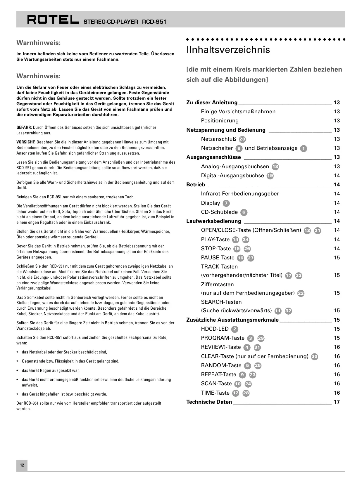 STEREO-CD-PLAYER RCD-951 Warnhinweis: Im Innern befinden sich keine vom Bediener zu wartenden Teile. Überlassen Sie Wartungsarbeiten stets nur einem Fachmann. ○ ○ ○ ○ ○ ○ ○ ○ ○ ○ ○ ○ ○ ○ ○ ○ ○ ○ ○ ○ ○ ○ ○ ○ ○ ○ ○ ○ ○ ○ ○ ○ ○ IInhaltsverzeichnis Warnhinweis: [die mit einem Kreis markierten Zahlen beziehen sich auf die Abbildungen] Um die Gefahr von Feuer oder eines elektrischen Schlags zu vermeiden, darf keine Feuchtigkeit in das Geräteinnere gelangen. Feste Gegenstände dürfen nicht in das Gehäuse gesteckt werden. Sollte trotzdem ein fester Gegenstand oder Feuchtigkeit in das Gerät gelangen, trennen Sie das Gerät sofort vom Netz ab. Lassen Sie das Gerät von einem Fachmann prüfen und die notwendigen Reparaturarbeiten durchführen. Zu dieser Anleitung __________________________________ 13 GEFAHR: Durch Öffnen des Gehäuses setzen Sie sich unsichtbarer, gefährlicher Laserstrahlung aus. VORSICHT: Beachten Sie die in dieser Anleitung gegebenen Hinweise zum Umgang mit Bedienelementen, zu den Einstellmöglichkeiten oder zu den Bedienungsvorschriften. Ansonsten laufen Sie Gefahr, sich gefährlicher Strahlung auszusetzen. Lesen Sie sich die Bedienungsanleitung vor dem Anschließen und der Inbetriebnahme des RCD-951 genau durch. Die Bedienungsanleitung sollte so aufbewahrt werden, daß sie jederzeit zugänglich ist. Befolgen Sie alle Warn- und Sicherheitshinweise in der Bedienungsanleitung und auf dem Gerät. Reinigen Sie den RCD-951 nur mit einem sauberen, trockenen Tuch. Die Ventilationsöffnungen am Gerät dürfen nicht blockiert werden. Stellen Sie das Gerät daher weder auf ein Bett, Sofa, Teppich oder ähnliche Oberflächen. Stellen Sie das Gerät nicht an einem Ort auf, an dem keine ausreichende Luftzufuhr gegeben ist, zum Beispiel in einem engen Regalfach oder in einem Einbauschrank. Einige Vorsichtsmaßnahmen
