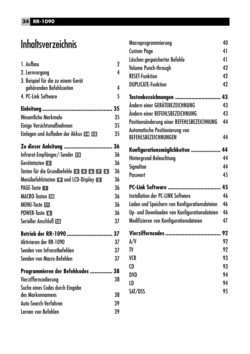 POWER-Taste Serieller Anschluß Betrieb der RR-1090 ............................... 37 Aktivieren der RR-1090 Senden von Infrarotbefehlen Senden von Macro-Befehlen Programmieren der Befehlcodes ............... 38 Vierzifferncodierung Suche eines Codes durch Eingabe des Markennamens Auto-Search-Verfahren Lernen von Befehlen
