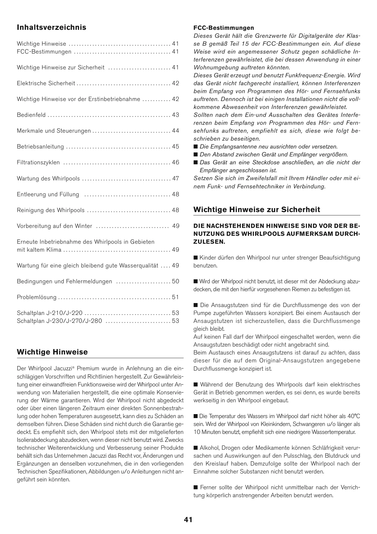 - Schaltplan J-230/J-270/J-280 Wichtige Hinweise Der Whirlpool Jacuzzi® Premium wurde in Anlehnung an die einschlägigen Vorschriften und Richtlinien hergestellt. Zur Gewährleistung einer einwandfreien Funktionsweise wird der Whirlpool unter Anwendung von Materialien hergestellt, die eine optimale Konservierung der Wärme garantieren. Wird der Whirlpool nicht abgedeckt oder über einen längeren Zeitraum einer direkten Sonnenbestrahlung oder hohen Temperaturen ausgesetzt, kann dies zu Schäden an demselben führen. Diese Schäden sind nicht durch die Garantie gedeckt. Es empfiehlt sich, den Whirlpool stets mit der mitgelieferten Isolierabdeckung abzudecken, wenn dieser nicht benutzt wird. Zwecks technischer Weiterentwicklung und Verbesserung seiner Produkte behält sich das Unternehmen Jacuzzi das Recht vor, Änderungen und Ergänzungen an denselben vorzunehmen, die in den vorliegenden Technischen Spezifikationen, Abbildungen u/o Anleitungen nicht angeführt sein könnten. Während der Benutzung des Whirlpools darf kein elektrisches Gerät in Betrieb genommen werden, es sei denn, es wurde bereits werkseitig in den Whirlpool eingebaut. Die Temperatur des Wassers im Whirlpool darf nicht höher als 40°C sein. Wird der Whirlpool von Kleinkindern, Schwangeren u/o länger als 10 Minuten benutzt, empfiehlt sich eine niedrigere Wassertemperatur. Alkohol, Drogen oder Medikamente können Schläfrigkeit verursachen und Auswirkungen auf den Pulsschlag, den Blutdruck und den Kreislauf haben. Demzufolge sollte der Whirlpool nach der Einnahme solcher Substanzen nicht benutzt werden. Ferner sollte der Whirlpool nicht unmittelbar nach der Verrichtung körperlich anstrengender Arbeiten benutzt werden. p. 53