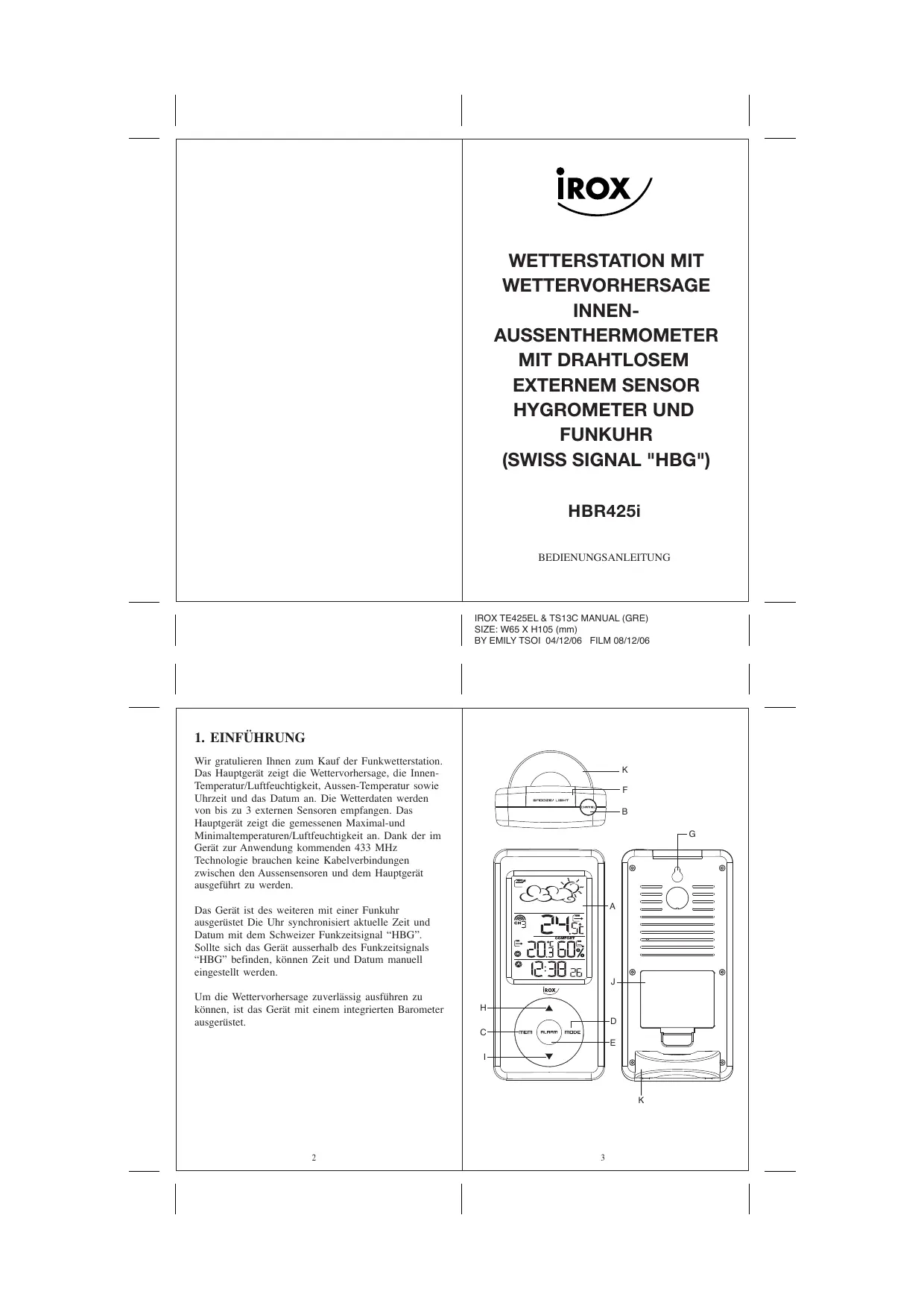 HBR425I - Wetterstation IROX - Kostenlose Bedienungsanleitung