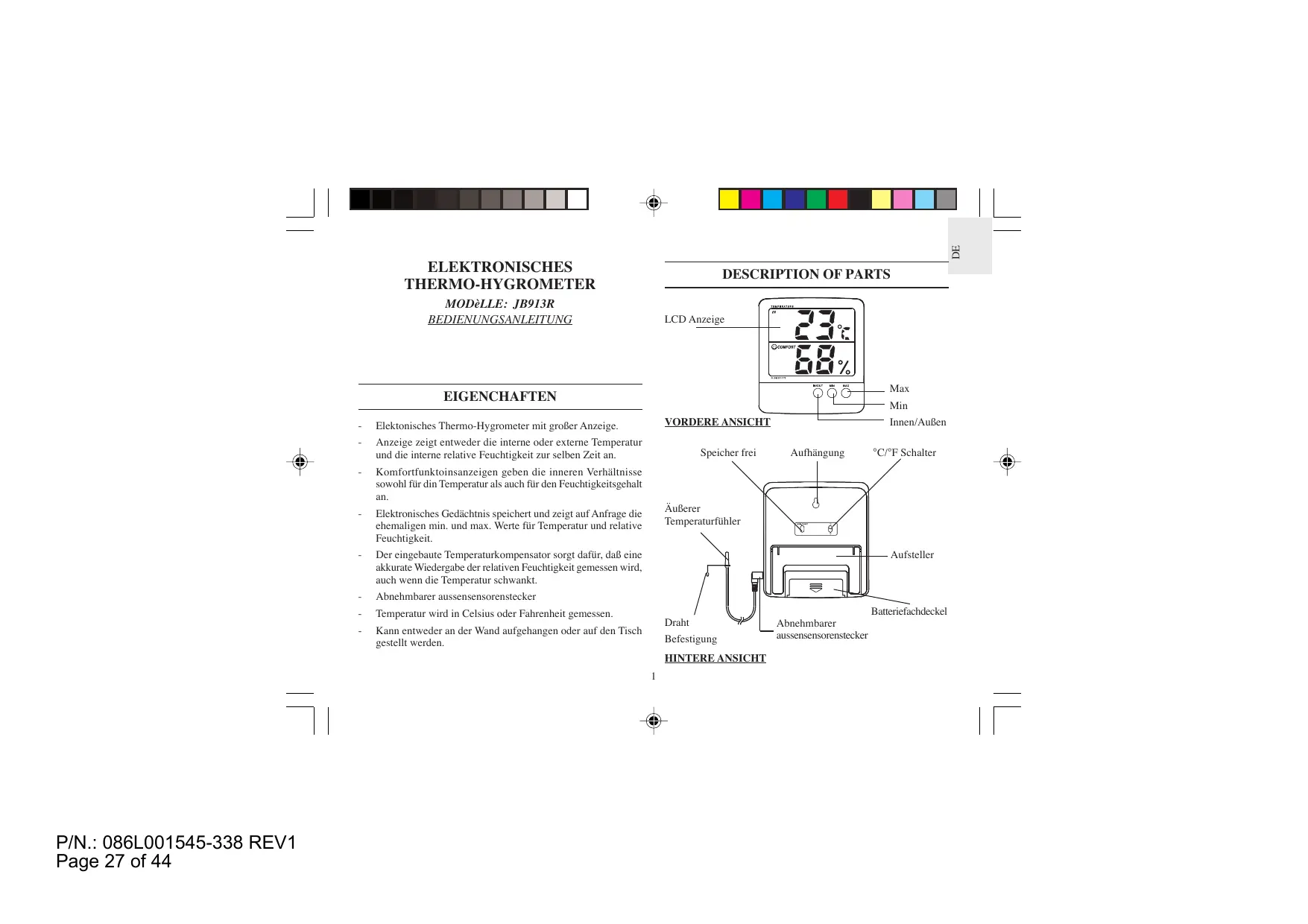 JB913R - Elektronisches Thermometer/Hygrometer IROX - Kostenlose Bedienungsanleitung