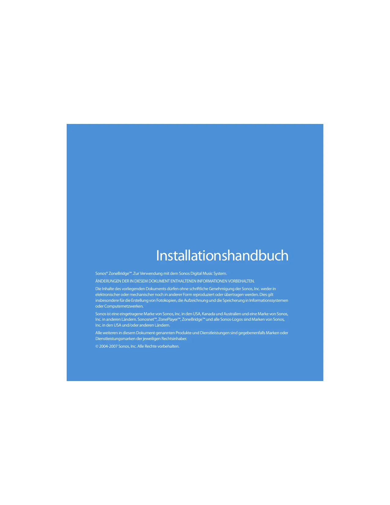 as vases, on the apparatus. Installationshandbuch Sonos® ZoneBridge™. Zur Verwendung mit dem Sonos Digital Music System. ÄNDERUNGEN DER IN DIESEM DOKUMENT ENTHALTENEN INFORMATIONEN VORBEHALTEN. Die Inhalte des vorliegenden Dokuments dürfen ohne schriftliche Genehmigung der Sonos, Inc. weder in elektronischer oder mechanischer noch in anderer Form reproduziert oder übertragen werden. Dies gilt insbesondere für die Erstellung von Fotokopien, die Aufzeichnung und die Speicherung in Informationssystemen oder Computernetzwerken. Sonos ist eine eingetragene Marke von Sonos, Inc. in den USA, Kanada und Australien und eine Marke von Sonos, Inc. in anderen Ländern. Sonosnet™, ZonePlayer™, ZoneBridge™ und alle Sonos-Logos sind Marken von Sonos, Inc. in den USA und/oder anderen Ländern. Alle weiteren in diesem Dokument genannten Produkte und Dienstleistungen sind gegebenenfalls Marken oder Dienstleistungsmarken der jeweiligen Rechtsinhaber. © 2004-2007 Sonos, Inc. Alle Rechte vorbehalten.