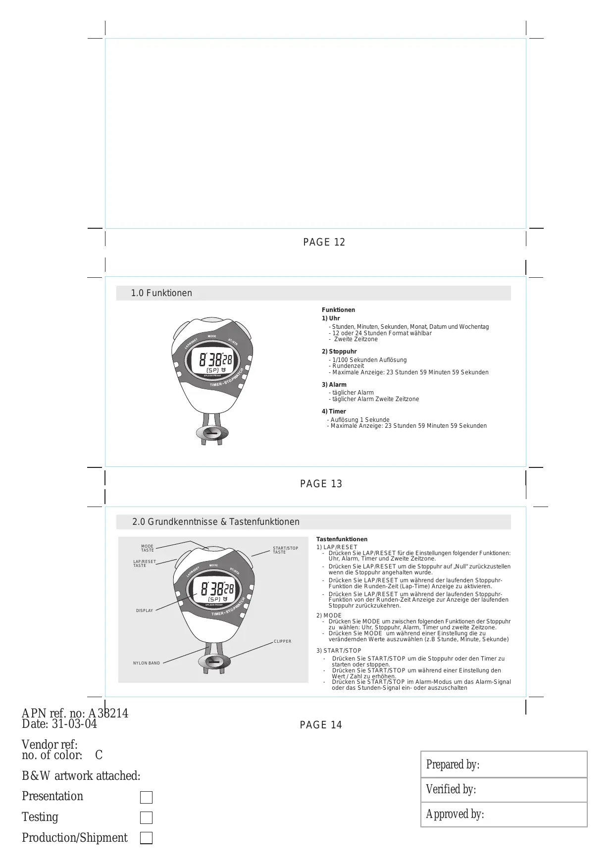 4 MAL APN ref. no: A38214 Date: 31-03-04 Vendor ref: no. of color: C B&W artwork attached: STOPPUHR DISPLAY STOPPUHR “LAUFT” INDIKATOR BLINKT STOPPUHR “LAUFT” INDIKATOR BLINKT UHR Allgemein