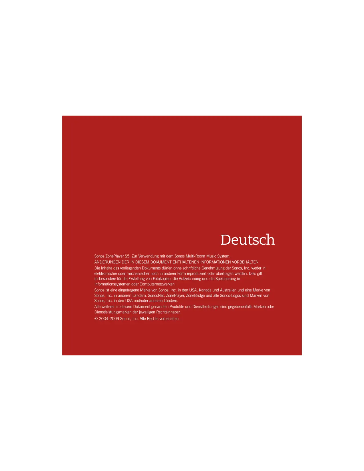 apparatus has been damaged in any way, such as power-supply cable or plug is damaged, liquid has been spilled or objects have fallen into the apparatus, the apparatus has been exposed to rain or moisture, does not operate normally, or has been dropped. Deutsch Sonos ZonePlayer S5. Zur Verwendung mit dem Sonos Multi-Room Music System. ÄNDERUNGEN DER IN DIESEM DOKUMENT ENTHALTENEN INFORMATIONEN VORBEHALTEN. Die Inhalte des vorliegenden Dokuments dürfen ohne schriftliche Genehmigung der Sonos, Inc. weder in elektronischer oder mechanischer noch in anderer Form reproduziert oder übertragen werden. Dies gilt insbesondere für die Erstellung von Fotokopien, die Aufzeichnung und die Speicherung in Informationssystemen oder Computernetzwerken. Sonos ist eine eingetragene Marke von Sonos, Inc. in den USA, Kanada und Australien und eine Marke von Sonos, Inc. in anderen Ländern. SonosNet, ZonePlayer, ZoneBridge und alle Sonos-Logos sind Marken von Sonos, Inc. in den USA und/oder anderen Ländern. Alle weiteren in diesem Dokument genannten Produkte und Dienstleistungen sind gegebenenfalls Marken oder Dienstleistungsmarken der jeweiligen Rechtsinhaber. © 2004-2009 Sonos, Inc. Alle Rechte vorbehalten. SVENSKA NEDERLANDS DEUTSCH DEUTSCH