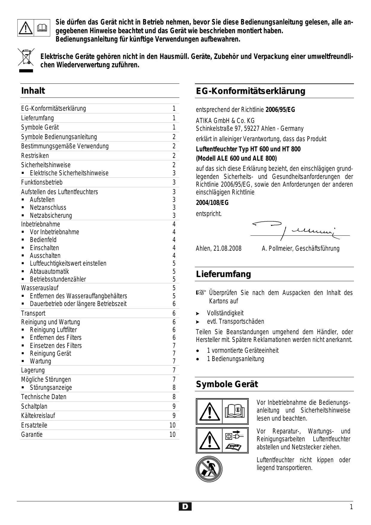 ALE 800 - Luftentfeuchter ATIKA - Kostenlose Bedienungsanleitung