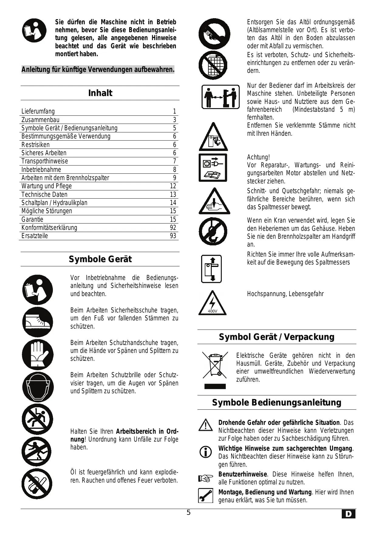 Sie dürfen die Maschine nicht in Betrieb nehmen, bevor Sie diese Bedienungsanleitung gelesen, alle angegebenen Hinweise beachtet und das Gerät wie beschrieben montiert haben. Entsorgen Sie das Altöl ordnungsgemäß (Altölsammelstelle vor Ort). Es ist verboten das Altöl in den Boden abzulassen oder mit Abfall zu vermischen. Es ist verboten, Schutz- und Sicherheitseinrichtungen zu entfernen oder zu verändern. Anleitung für künftige Verwendungen aufbewahren. Nur der Bediener darf im Arbeitskreis der Maschine stehen. Unbeteiligte Personen sowie Haus- und Nutztiere aus dem Gefahrenbereich (Mindestabstand 5 m) fernhalten. Entfernen Sie verklemmte Stämme nicht mit Ihren Händen. Inhalt Lieferumfang Zusammenbau Symbole Gerät / Bedienungsanleitung Bestimmungsgemäße Verwendung Restrisiken Sicheres Arbeiten Transporthinweise Inbetriebnahme Arbeiten mit dem Brennholzspalter Wartung und Pflege Technische Daten Schaltplan / Hydraulikplan Mögliche Störungen Garantie Konformitätserklärung Ersatzteile