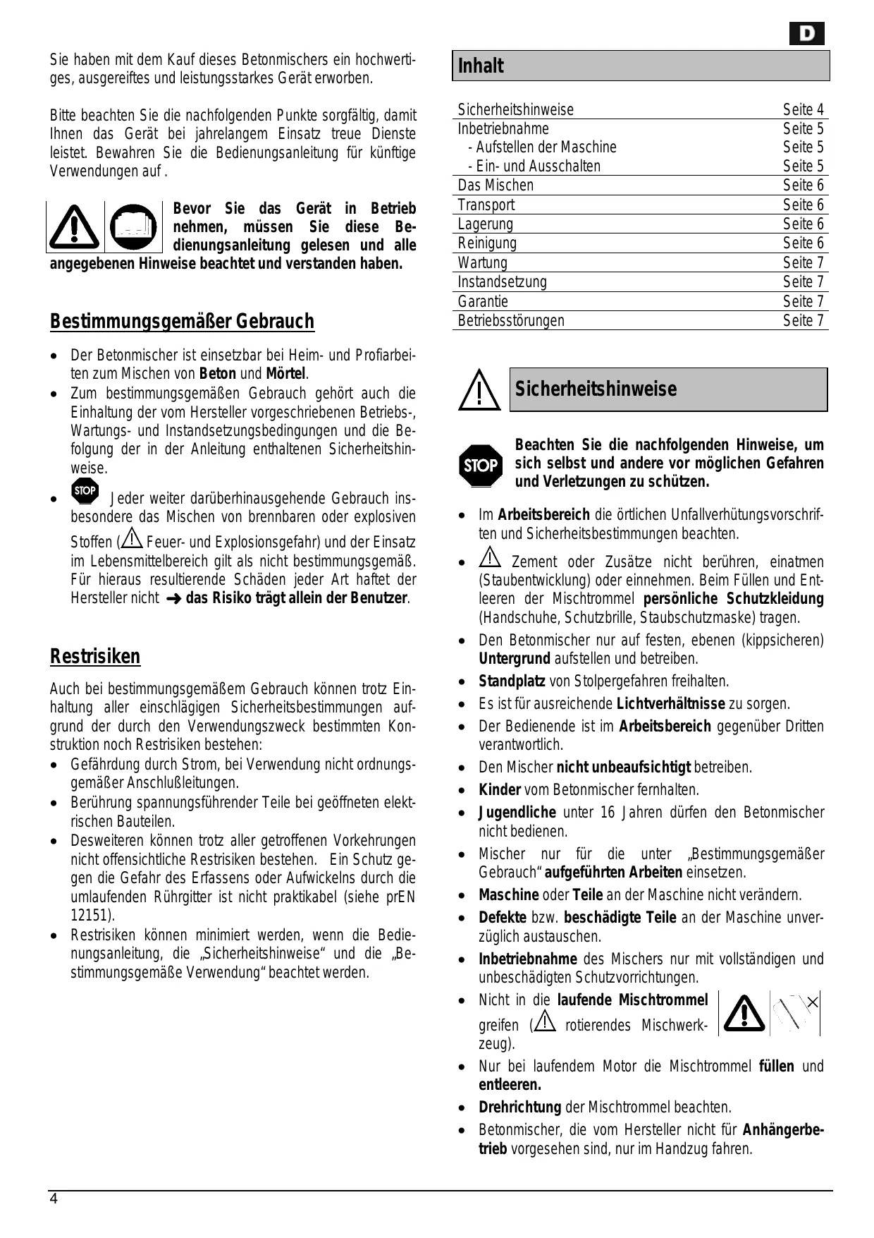 Sie haben mit dem Kauf dieses Betonmischers ein hochwerti- ges, ausgereiftes und leistungsstarkes Gerät erworben. Bitte beachten Sie die nachfolgenden Punkte sorgfältig, damit lhnen das Gerät bei jahrelangem Einsatz treue Dienste leistet. Bewahren Sie die Bedienungsanleitung für künftige Verwendungen auf. Bevor Sie das Gerät in Betrieb A nehmen, müssen Sie diese Be- dienungsanleitung gelesen und alle angegebenen Hinweise beachtet und verstanden haben, Bestimmungsgemäker Gebrauch + Der Betonmischer ist einsetzbar bei Heim- und Profiarbei- ten zum Mischen von Beton und Môrtel. e Zum bestimmungsgemäRen Gebrauch gehôrt auch die Einhaltung der vom Hersteller vorgeschriebenen Betriebs-, Wartungs- und Instandsetzungsbedingungen und die Be- folgung der in der Anleitung enthaltenen Sicherheitshin- weise. . [or] Jeder weiter darüberhinausgehende Gebrauch ins- besondere das Mischen von brennbaren oder explosiven Stoffen À Feuer- und Explosionsgefahr) und der Einsatz im Lebensmittelbereich gilt als nicht bestimmungsgemäk. Für hieraus resultierende Schäden jeder Art haftet der Hersteller nicht = das Risiko trägt allein der Benutzer. Restrisiken Auch bei bestimmungsgemäem Gebrauch kônnen trot Ein- haltung aller einschlägigen Sicherheitsbestimmungen auf- grund der durch den Verwendungszweck bestimmten Kon- struktion noch Restrisiken bestehen: e_ Gefährdung durch Strom, bei Verwendung nicht ordnungs- gemäer AnschluRleitungen. *_ Berührung spannungsführender Teile bei geôffneten elekt- rischen Bauteilen. < Desweiteren kônnen trot aller getroffenen Vorkehrungen nicht offensichtliche Restrisiken bestehen. Ein Schutz ge- gen die Gefahr des Erfassens oder Aufwickelns durch die umlaufenden Rührgitter ist nicht praktikabel (siehe pre 12151). e Restrsiken kônnen minimiert werden, wenn die Bedie- nungsanleitung, die ,Sicherheitshinweise" und die ,Be- stimmungsgemäRe Verwendung" beachtet werden. Inhalt Sicherheitshinweise Seite 4 Inbetriebnahme Seite 5 Aufstellen der Maschine Seite 5 Ein- und Ausschalten Seite 5 Das Mischen Seite 6 Transport Seite 6 Lagerung Seite 6 Reinigung Seite 6 Wartung Seite 7 Instandsetzung Seite 7 Garantie Seite 7 Betriebsstôrungen Seite 7