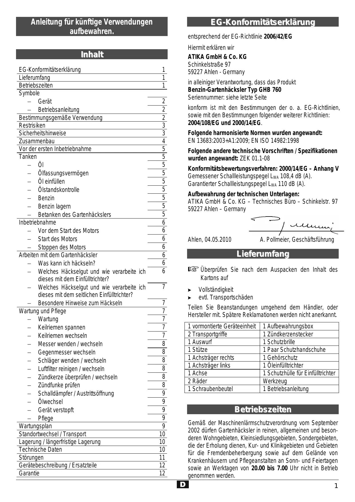 GHB 760 - Benzin-Gartenschredder ATIKA - Kostenlose Bedienungsanleitung