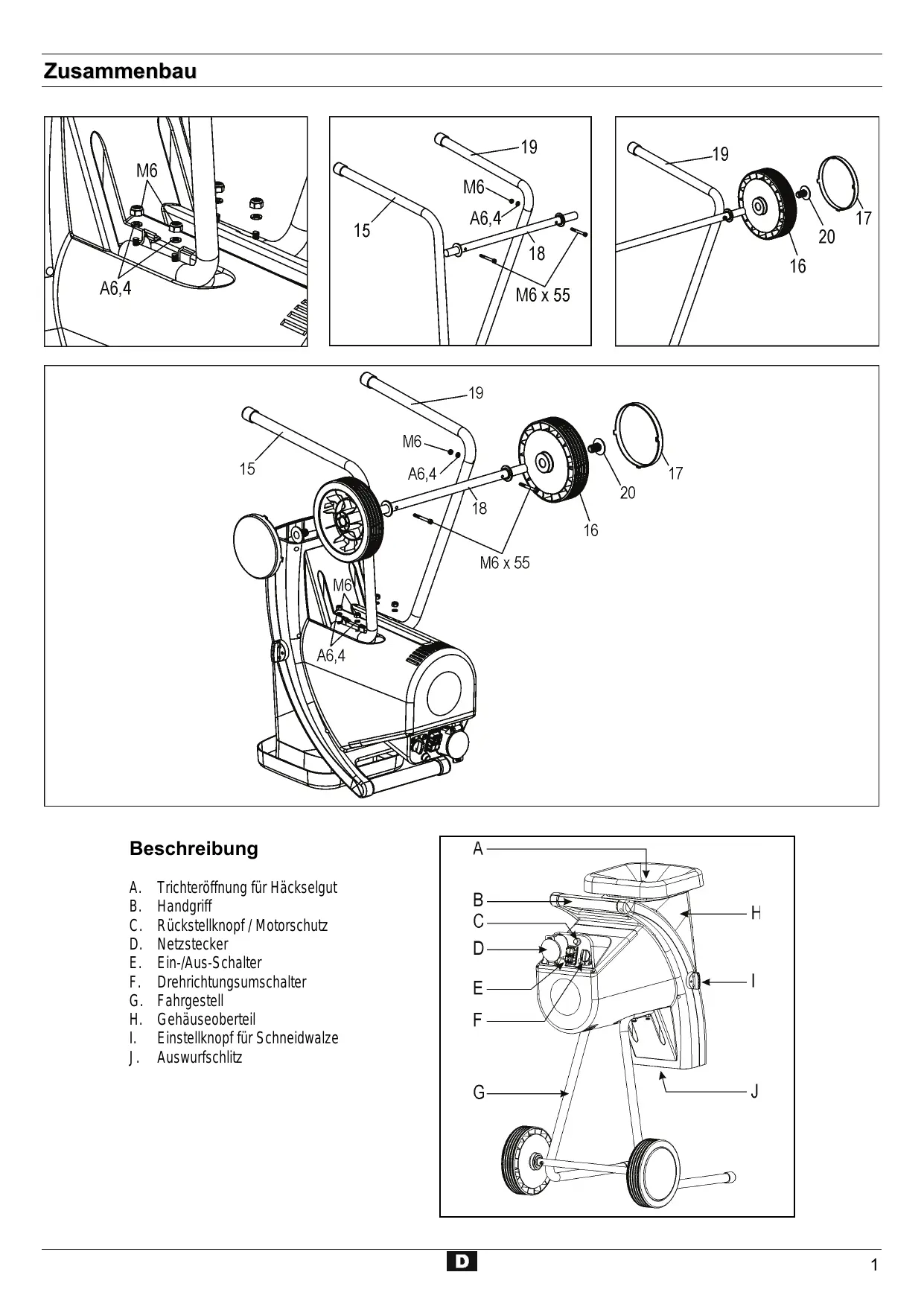 Trichteröffnung für Häckselgut Handgriff Rückstellknopf / Motorschutz Netzstecker Ein-/Aus-Schalter Drehrichtungsumschalter Fahrgestell Gehäuseoberteil Einstellknopf für Schneidwalze Auswurfschlitz