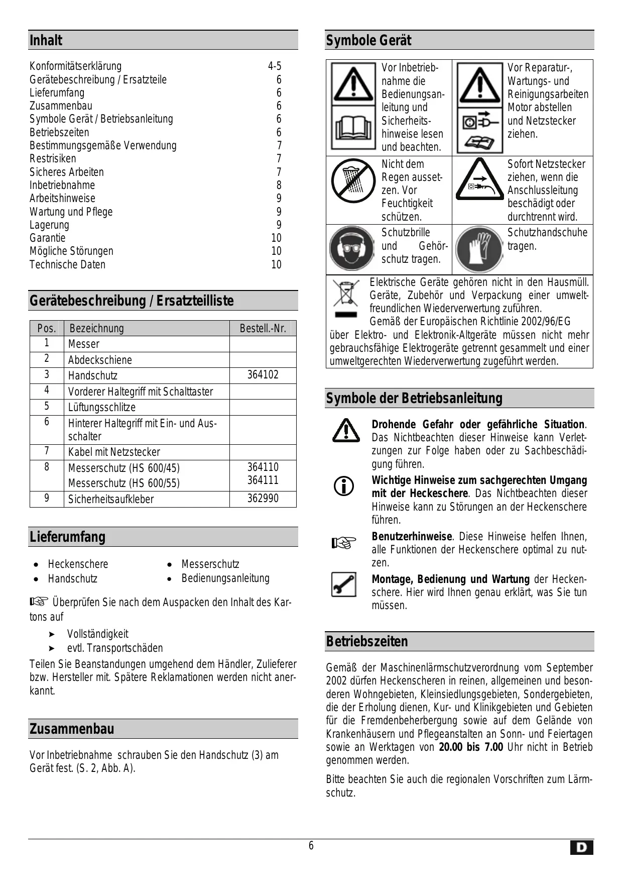 - Bedienungsanleitung Überprüfen Sie nach dem Auspacken den Inhalt des Kartons auf ! Vollständigkeit ! evtl. Transportschäden Teilen Sie Beanstandungen umgehend dem Händler, Zulieferer bzw. Hersteller mit. Spätere Reklamationen werden nicht anerkannt. Drohende Gefahr oder gefährliche Situation. Das Nichtbeachten dieser Hinweise kann Verletzungen zur Folge haben oder zu Sachbeschädigung führen. Wichtige Hinweise zum sachgerechten Umgang mit der Heckeschere. Das Nichtbeachten dieser Hinweise kann zu Störungen an der Heckenschere führen. Benutzerhinweise. Diese Hinweise helfen Ihnen, alle Funktionen der Heckenschere optimal zu nutzen. Montage, Bedienung und Wartung der Heckenschere. Hier wird Ihnen genau erklärt, was Sie tun müssen. Betriebszeiten Gemäß der Maschinenlärmschutzverordnung vom September 2002 dürfen Heckenscheren in reinen, allgemeinen und besonderen Wohngebieten, Kleinsiedlungsgebieten, Sondergebieten, die der Erholung dienen, Kur- und Klinikgebieten und Gebieten für die Fremdenbeherbergung sowie auf dem Gelände von Krankenhäusern und Pflegeanstalten an Sonn- und Feiertagen sowie an Werktagen von 20.00 bis 7.00 Uhr nicht in Betrieb genommen werden. Zusammenbau Vor Inbetriebnahme schrauben Sie den Handschutz (3) am Gerät fest. (S. 2, Abb. A). Bitte beachten Sie auch die regionalen Vorschriften zum Lärmschutz.