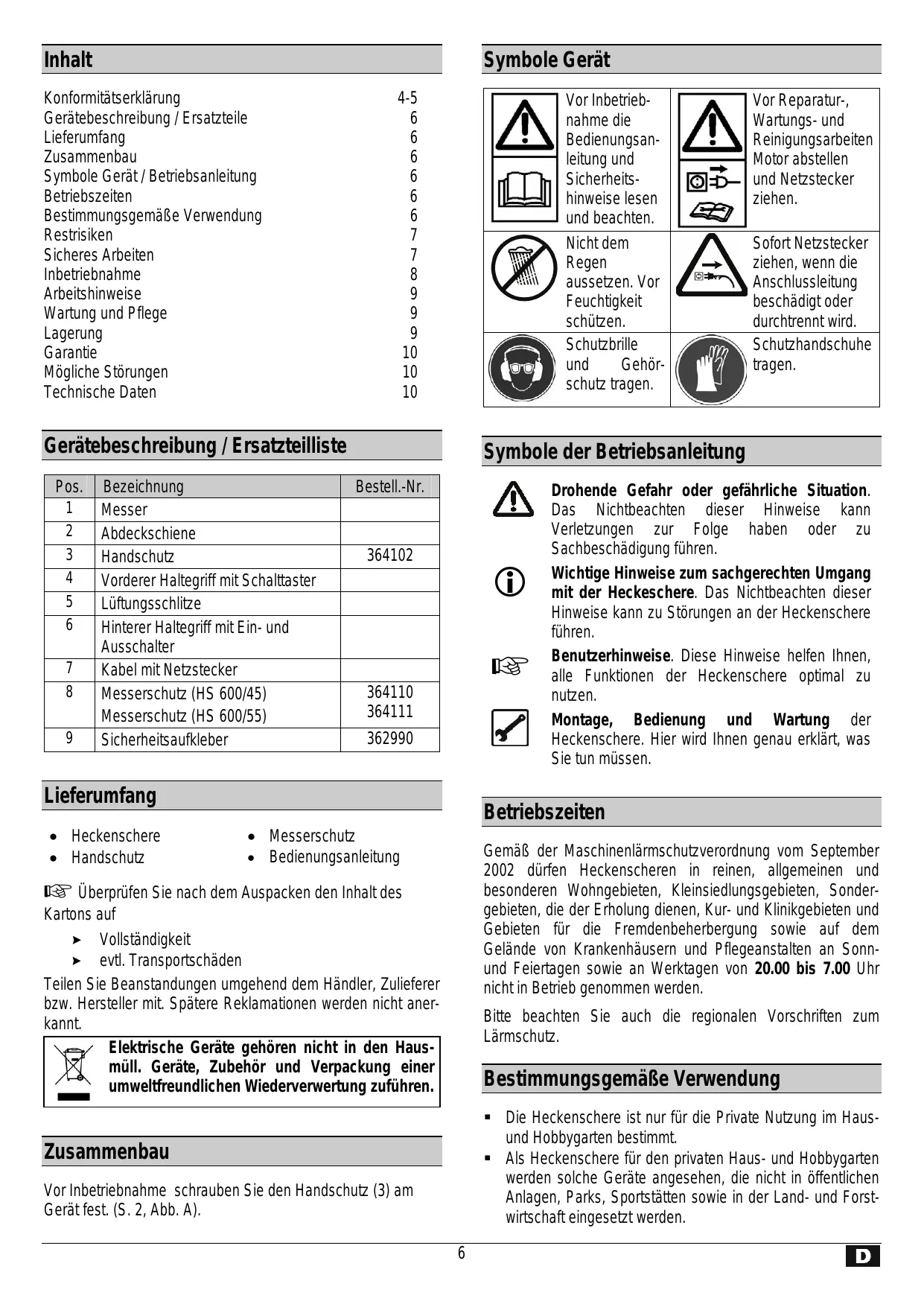 Drohende Gefahr oder gefährliche Situation. Das Nichtbeachten dieser Hinweise kann Verletzungen zur Folge haben oder zu Sachbeschädigung führen. Wichtige Hinweise zum sachgerechten Umgang mit der Heckeschere. Das Nichtbeachten dieser Hinweise kann zu Störungen an der Heckenschere führen. Benutzerhinweise. Diese Hinweise helfen Ihnen, alle Funktionen der Heckenschere optimal zu nutzen. Montage, Bedienung und Wartung der Heckenschere. Hier wird Ihnen genau erklärt, was Sie tun müssen.