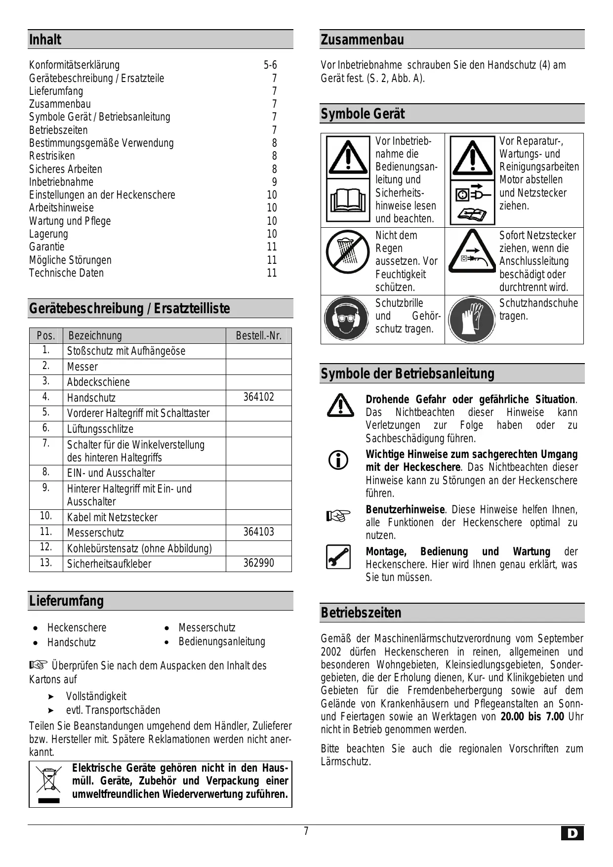 - Bedienungsanleitung Gemäß der Maschinenlärmschutzverordnung vom September 2002 dürfen Heckenscheren in reinen, allgemeinen und besonderen Wohngebieten, Kleinsiedlungsgebieten, Sondergebieten, die der Erholung dienen, Kur- und Klinikgebieten und Gebieten für die Fremdenbeherbergung sowie auf dem Gelände von Krankenhäusern und Pflegeanstalten an Sonnund Feiertagen sowie an Werktagen von 20.00 bis 7.00 Uhr nicht in Betrieb genommen werden. Überprüfen Sie nach dem Auspacken den Inhalt des Kartons auf ! Vollständigkeit ! evtl. Transportschäden Teilen Sie Beanstandungen umgehend dem Händler, Zulieferer bzw. Hersteller mit. Spätere Reklamationen werden nicht anerkannt. Elektrische Geräte gehören nicht in den Hausmüll. Geräte, Zubehör und Verpackung einer umweltfreundlichen Wiederverwertung zuführen. Bitte beachten Sie auch die regionalen Vorschriften zum Lärmschutz.