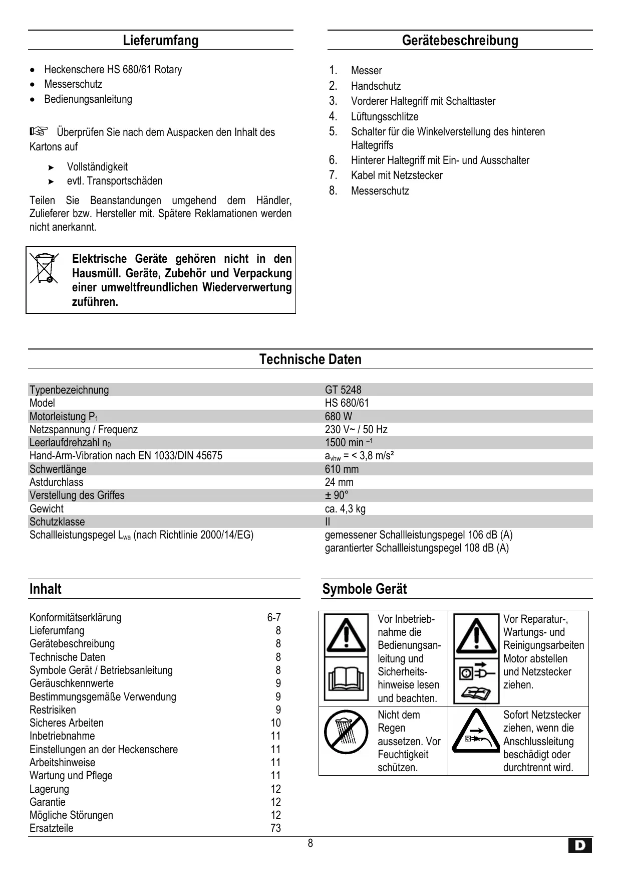 GT 5248 HS 680/61 680 W 230 V~ / 50 Hz 1500 min –1 avhw = < 3,8 m/s² 610 mm 24 mm ± 90° ca. 4,3 kg II gemessener Schallleistungspegel 106 dB (A) garantierter Schallleistungspegel 108 dB (A)