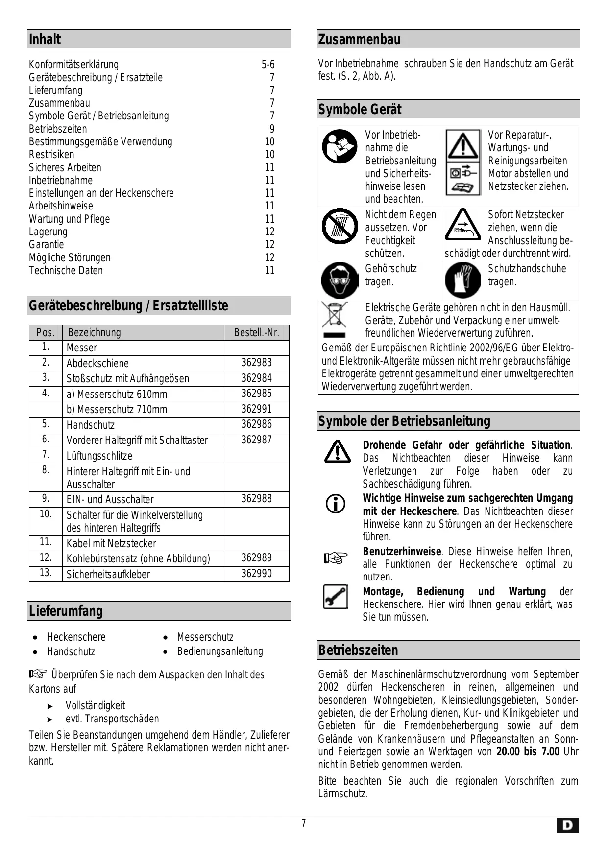 Mise en service 19 les conseils de la bougie avant Consignes de travail 20 sécurité avant ||[f@j5-| toute opération Maintenance et entretien 20 là mise en | d'entretien, de Stockage 20 marche eten remise en état ou Garantie 21 tenir compte de nettoyage. Perturbations susceptibles de se présenter 21 pendant le Caractéristiques techniques 21 fonctionement. Ne pas ex- Retirer immédiate- = = poser la ment la fiche du Description de l'équipement / © machine à la secteur lorsque le Pièces de rechange pluie ou à câble de connexion l'humidité. est endommagé. Pos. Référence de commande Désignation Porter des Porter des gants de 1. | Couteau Q lunettes de protection. 2. | Barre de recouvrement 362983 protection. 3. | Protection anti-choc avec pattes de 362984 Ne jamais jeter un appareil électrique aux ordures suspension ménagères. Les appareils, les accessoires et les 4. |) Protection des couteaux 610 mm 362985 mms Smelages doivent être recyclés de façon non b) Protection des couteaux 710 mm 362991 A polluante. ; A ; = Conformément à la directive européenne 2002/96/CE relative 5: _ | Protection des mains 362986 aux déchets d'équipements électriques et électroniques, les 6. | Poignée avant avec bouton 362987 appareils électriques ne pouvant plus être utilisés doivent être d'interruption collectés séparément et recyclés d'une manière respectueuse 7. | Fentes d'aération de l'environnement. 8 | Poignée arrière avec interrupteur 9] Interrupteur 362988 Symbolique de ces instructions de service 10. | Cliquet pour le réglage de l'angle de la poignée arrière À Danger imminent ou situation dangereuse. 11. | Câble avec fiche de secteur L'inobservation de ces indications génère des 12. | jeu de charbons (sans figure] 362989 risques de blessures ou d'endommagements 13. | Etiquette de sécurité 362990 matériels. Indications importantes pour un emploi conforme à l’usage prévu. L'inobservation de ces Fourniture indications peut provoquer des défauts de fonctionnement. e Taille-haie + Protection des mains