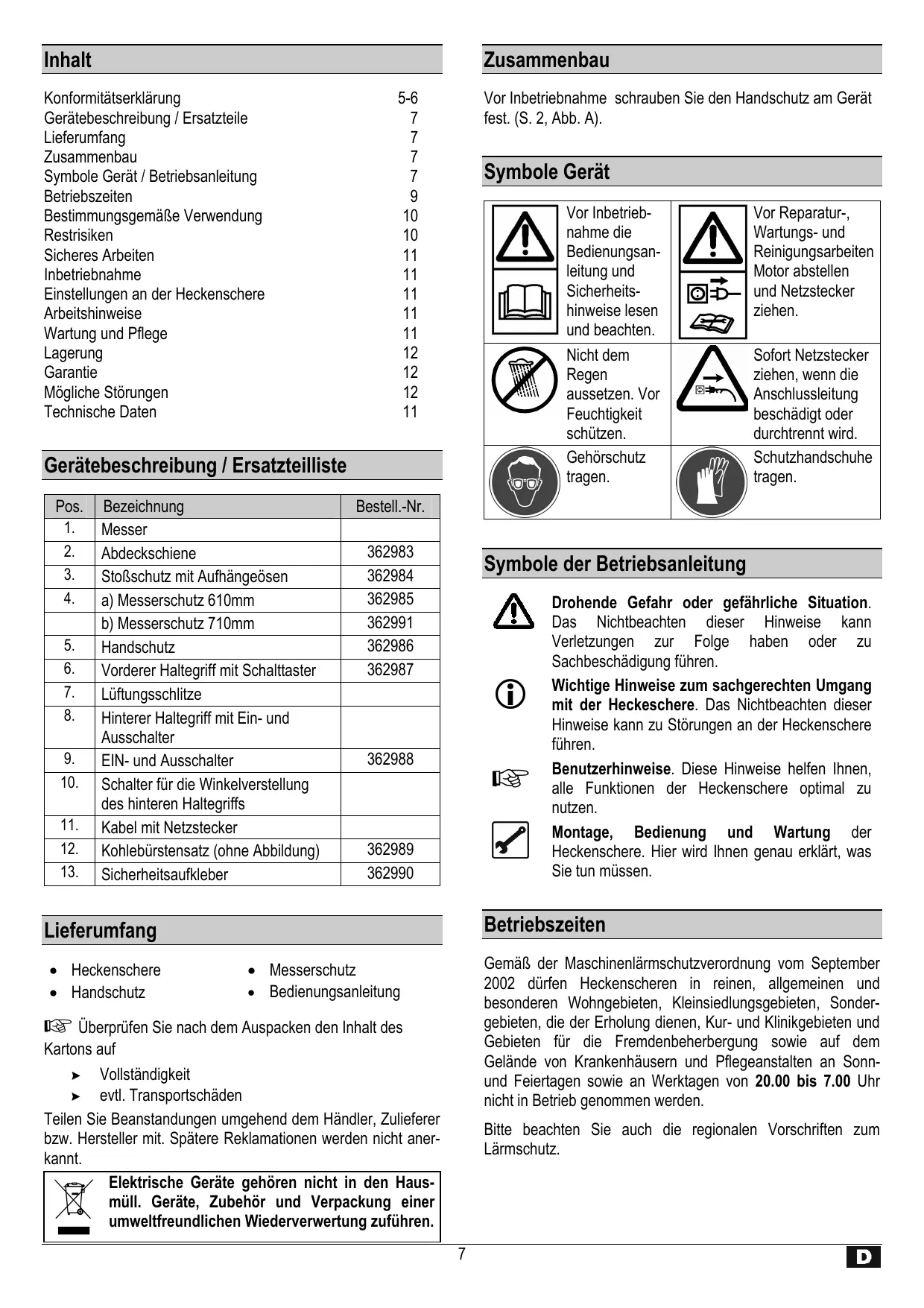 Inhalt Zusammenbau Konformitätserklärung Gerätebeschreibung / Ersatzteile Lieferumfang Zusammenbau Symbole Gerät / Betriebsanleitung Betriebszeiten Bestimmungsgemäße Verwendung Restrisiken Sicheres Arbeiten Inbetriebnahme Einstellungen an der Heckenschere Arbeitshinweise Wartung und Pflege Lagerung Garantie Mögliche Störungen Technische Daten 5-6