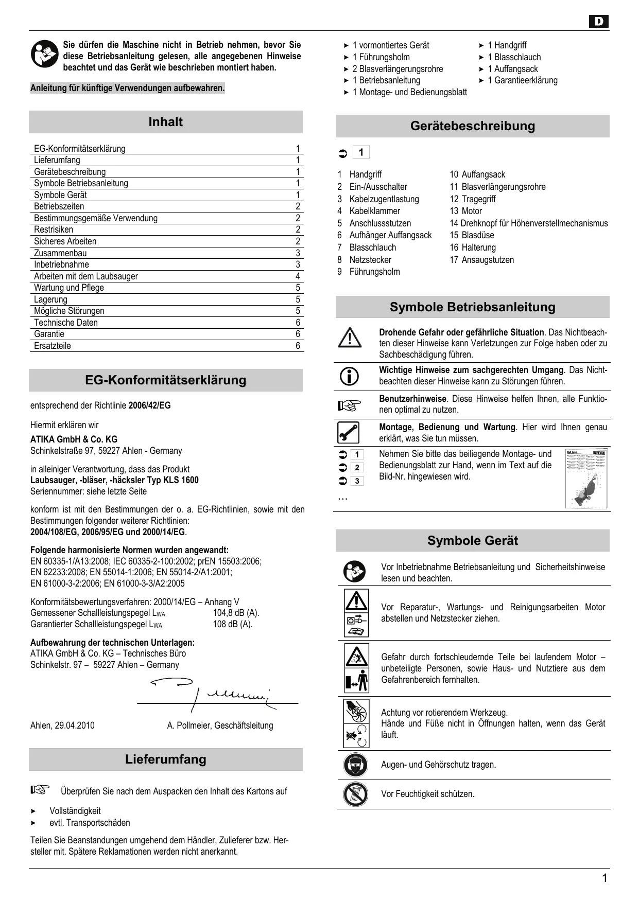 Konformitätsbewertungsverfahren: 2000/14/EG - Anhang V Gemessener Schallleistungspegel La 104,8 dB (A). Garantierter Schallleistungspegel Lwa 108 dB (A). Aufbewahrung der technischen Unterlagen: ATIKA GmbH & Co. KG - Technisches Büro Schinkelstr. 97 - 59227 Ahlen - Germany ll