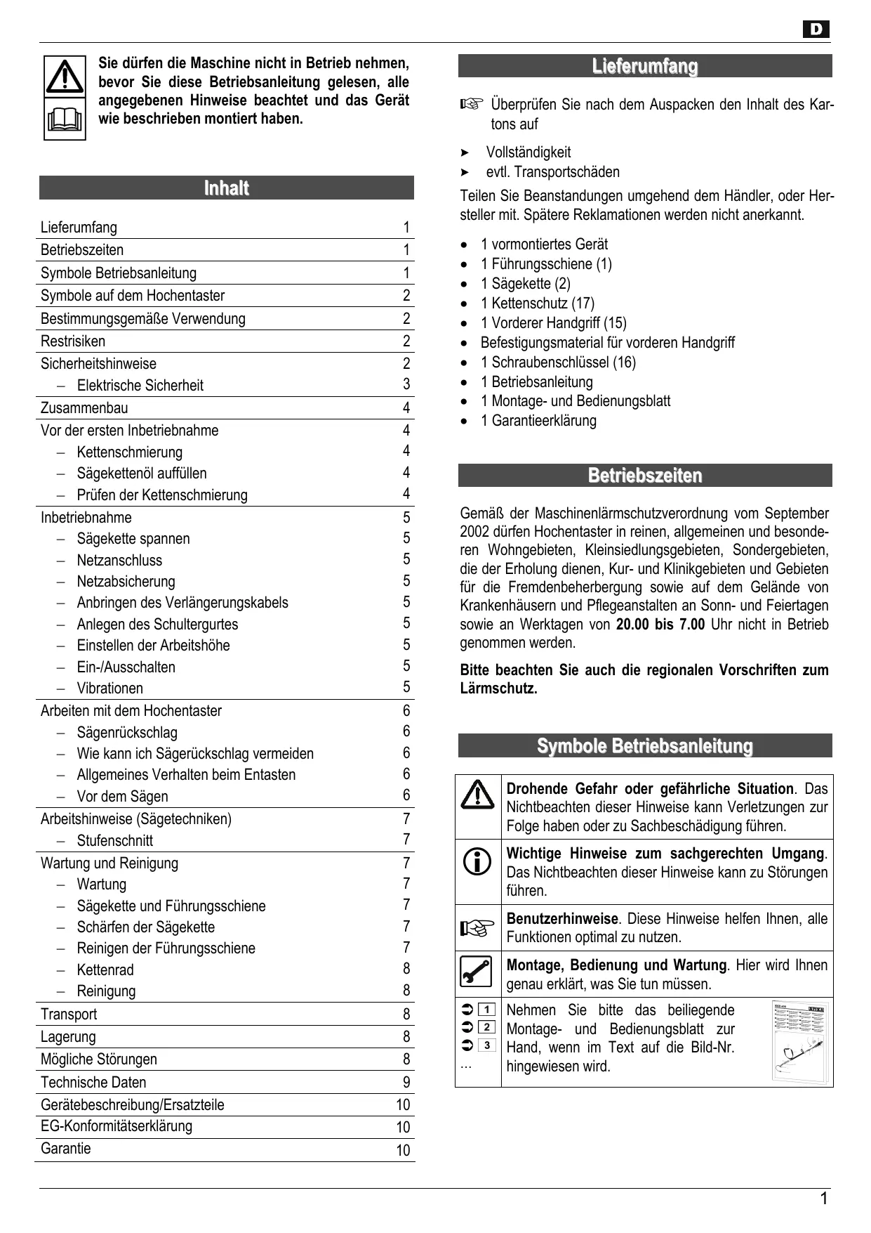 Geben oder Verleihen Sie den Hochentaster nur an Per- sonen, die mit dem Hochentaster und seiner Handhabung vertraut sind. Geben Sie die Sicherheitshinweise an alle Personen weiter, die mit der Maschine arbeiten. Reparaturen am Gerät haben durch den Hersteller, bzw. von ihm benannte Firmen zu erfolgen.