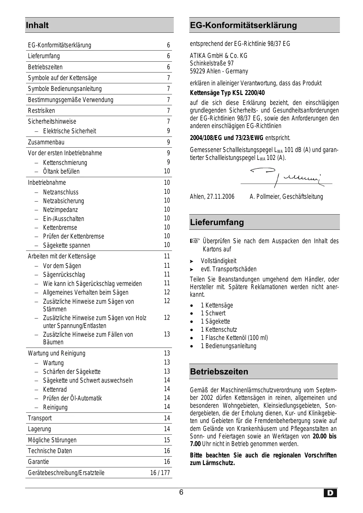 EG-Konformitätserklärung 6 Lieferumfang 6 Betriebszeiten 6 Symbole auf der Kettensäge 7 Symbole Bedienungsanleitung l Bestimmungsgemäke Verwendung l Restrisiken 7 Sicherheitshinweise 7 — Elektrische Sicherheit 9 Zusammenbau 9 Vor der ersten Inbetriebnahme 9 — Kettenschmierung 9 — Oltank befüllen 10 Inbetriebnahme 10 — Netzanschluss 10 — Netzabsicherung 10 — Netzimpedanz 10 — Ein-/Ausschalten 10 — Kettenbremse 10 — Prüfen der Kettenbremse 10 — Sägekette spannen 10 Arbeiten mit der Kettensäge il — Vor dem Sägen 11 — Sägenrückschlag 11 — Wie kann ich Sägerückschlag vermeiden 11 — Allgemeines Verhalten beim Sägen 12 — Zusätzliche Hinweise zum S ägen von 12 Stämmen — Zusätzliche Hinweise zum Sägen von Holz 12 unter Spannung/E ntlasten — Zusätzliche Hinweise zum Fällen von 13 Bäumen Wartung und Reinigung 13 — Wartung 13 — Schärfen der Sägekette 13 — Sägekette und Schwert auswechseln 14 — Kettenrad 14 — Prüfen der Ül-Automatik 14 — _Reinigung 14 Transport 14 Lagerung 14 Môgliche Stérungen 15 Technische Daten 16 Garantie 16 Gerätebeschreibung/Ersatzteile 16/177