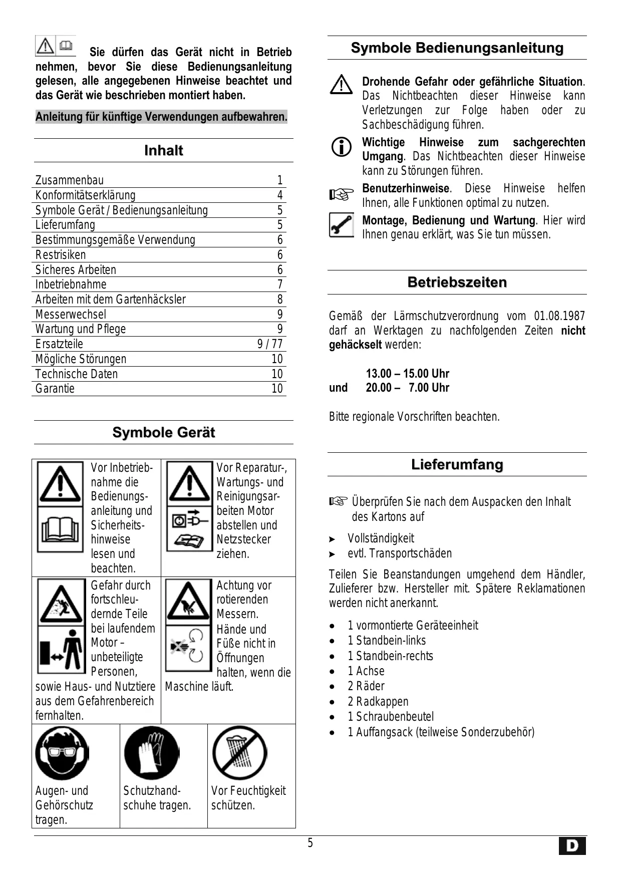 L Inhalt Zusammenbau Konformitätserklärung Symbole Gerät / Bedienungsanleitung Lieferumfang Bestimmungsgemäße Verwendung Restrisiken Sicheres Arbeiten Inbetriebnahme Arbeiten mit dem Gartenhäcksler Messerwechsel Wartung und Pflege Ersatzteile Mögliche Störungen Technische Daten Garantie
