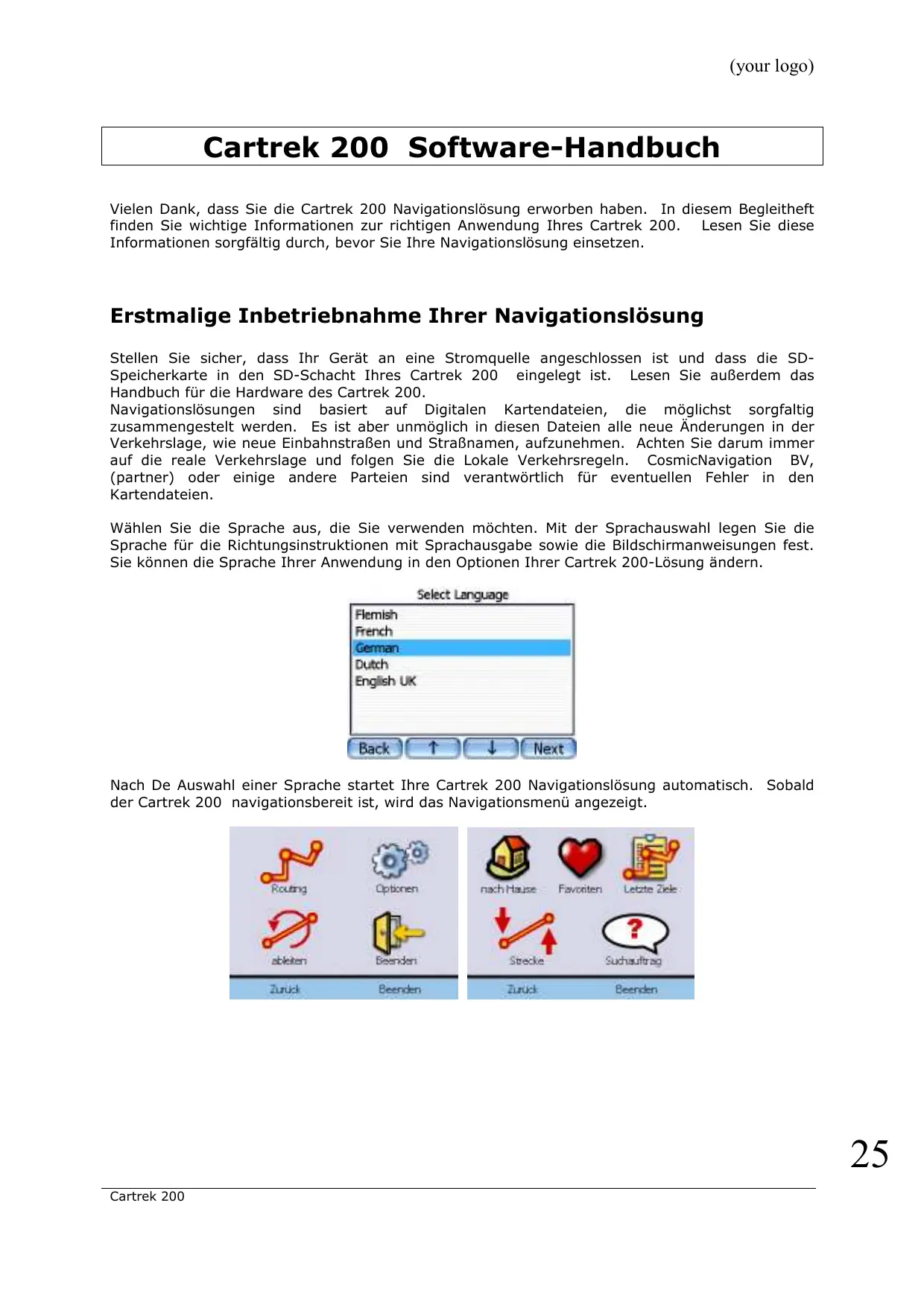 Cartrek 200 (your logo) Cartrek 200 Software-Handbuch Vielen Dank, dass Sie die Cartrek 200 Navigationslösung erworben haben. In diesem Begleitheft finden Sie wichtige Informationen zur richtigen Anwendung Ihres Cartrek 200. Lesen Sie diese Informationen sorgfältig durch, bevor Sie Ihre Navigationslösung einsetzen. Erstmalige Inbetriebnahme Ihrer Navigationslösung Stellen Sie sicher, dass Ihr Gerät an eine Stromquelle angeschlossen ist und dass die SDSpeicherkarte in den SD-Schacht Ihres Cartrek 200 eingelegt ist. Lesen Sie außerdem das Handbuch für die Hardware des Cartrek 200. Navigationslösungen sind basiert auf Digitalen Kartendateien, die möglichst sorgfaltig zusammengestelt werden. Es ist aber unmöglich in diesen Dateien alle neue Änderungen in der Verkehrslage, wie neue Einbahnstraßen und Straßnamen, aufzunehmen. Achten Sie darum immer auf die reale Verkehrslage und folgen Sie die Lokale Verkehrsregeln. CosmicNavigation BV, (partner) oder einige andere Parteien sind verantwörtlich für eventuellen Fehler in den Kartendateien. Wählen Sie die Sprache aus, die Sie verwenden möchten. Mit der Sprachauswahl legen Sie die Sprache für die Richtungsinstruktionen mit Sprachausgabe sowie die Bildschirmanweisungen fest. Sie können die Sprache Ihrer Anwendung in den Optionen Ihrer Cartrek 200-Lösung ändern. Nach De Auswahl einer Sprache startet Ihre Cartrek 200 Navigationslösung automatisch. Sobald der Cartrek 200 navigationsbereit ist, wird das Navigationsmenü angezeigt.