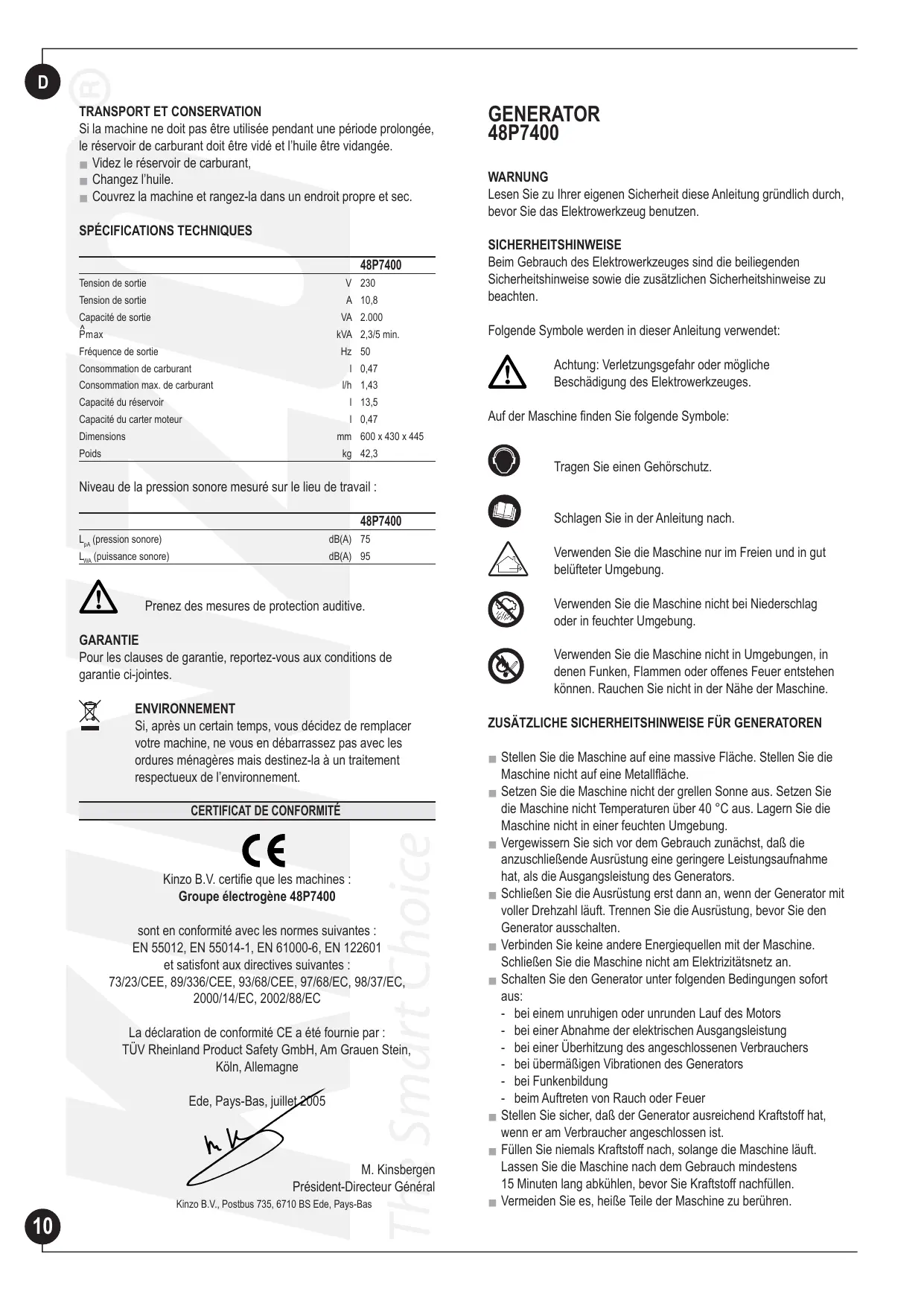 Kinzo B.V. erklärt hiermit, daß Generator 48P7400 Der Motor startet nicht entsprechend den Normen: EN 55012, EN 55014-1, EN 61000-6, EN 122601 Vergewissern Sie sich, daß der Kraftstoffhahn geöffnet ist. Vergewissern Sie sich, daß sich Kraftstoff im Tank befindet. Vergewissern Sie sich, daß der Ein-/Ausschalter eingeschaltet ist. und entsprechend folgenden Richtlinien konzipiert wurde: Überprüfen Sie den Ölstand. Ziehen Sie kräftiger an der Startschnur. Vergewissern Sie sich, daß sich das Zündkabel auf der Zündkerze befindet. Reinigen Sie die Zündkerze und überprüfen Sie den Elektrodenabstand. 73/23/EWG, 89/336/EWG, 93/68/EWG, 97/68/EC, 98/37/EC, 2000/14/EC, 2002/88/EC Der Motor läuft unrund Vergewissern Sie sich, daß die Zündkerze richtig angebracht ist. Vergewissern Sie sich, daß sich das Zündkabel auf der Zündkerze befindet. Reinigen Sie die Zündkerze und überprüfen Sie den Elektrodenabstand. Die EG-Zulassung wurde erteilt durch: TÜV Rheinland Produktsicherheit GmbH, Am Grauen Stein, Köln, Deutschland Vergewissern Sie sich, daß der richtige Kraftstoff verwendet wurde. Ede, Niederlande, Juli 2005 Der Generator erzeugt keinen Strom Überprüfen Sie, ob ein Kurzschluß oder eine Überlastung vorlag. Vergewissern Sie sich, daß der Rückstellschalter eingeschaltet ist. Überprüfen Sie die Verdrahtung.