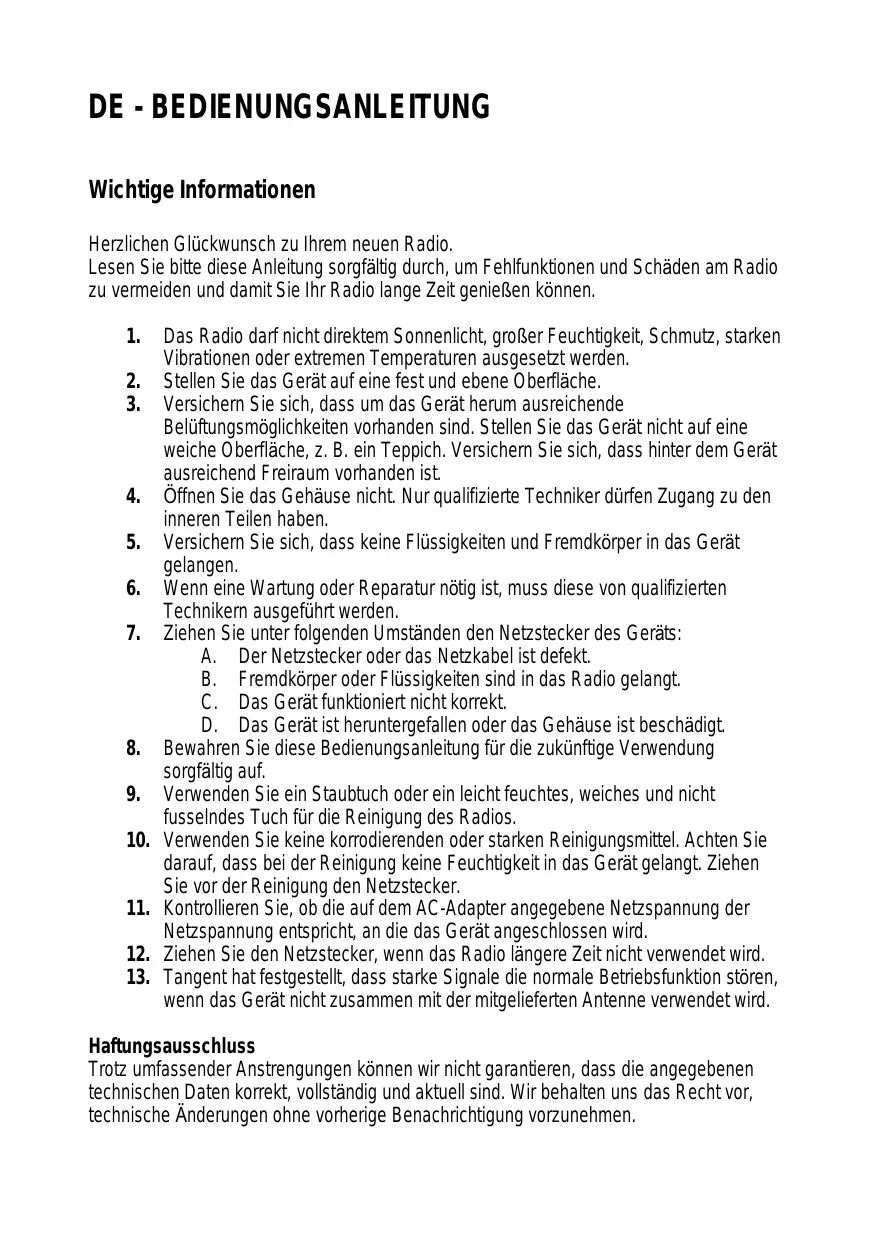 Das Radio darf nicht direktem Sonnenlicht, großer Feuchtigkeit, Schmutz, starken Vibrationen oder extremen Temperaturen ausgesetzt werden. Stellen Sie das Gerät auf eine fest und ebene Oberfläche. Versichern Sie sich, dass um das Gerät herum ausreichende Belüftungsmöglichkeiten vorhanden sind. Stellen Sie das Gerät nicht auf eine weiche Oberfläche, z. B. ein Teppich. Versichern Sie sich, dass hinter dem Gerät ausreichend Freiraum vorhanden ist. Öffnen Sie das Gehäuse nicht. Nur qualifizierte Techniker dürfen Zugang zu den inneren Teilen haben. Versichern Sie sich, dass keine Flüssigkeiten und Fremdkörper in das Gerät gelangen. Wenn eine Wartung oder Reparatur nötig ist, muss diese von qualifizierten Technikern ausgeführt werden. Ziehen Sie unter folgenden Umständen den Netzstecker des Geräts: A. Der Netzstecker oder das Netzkabel ist defekt. B. Fremdkörper oder Flüssigkeiten sind in das Radio gelangt. C. Das Gerät funktioniert nicht korrekt. D. Das Gerät ist heruntergefallen oder das Gehäuse ist beschädigt. Bewahren Sie diese Bedienungsanleitung für die zukünftige Verwendung sorgfältig auf. Verwenden Sie ein Staubtuch oder ein leicht feuchtes, weiches und nicht fusselndes Tuch für die Reinigung des Radios. Verwenden Sie keine korrodierenden oder starken Reinigungsmittel. Achten Sie darauf, dass bei der Reinigung keine Feuchtigkeit in das Gerät gelangt. Ziehen Sie vor der Reinigung den Netzstecker. Kontrollieren Sie, ob die auf dem AC-Adapter angegebene Netzspannung der Netzspannung entspricht, an die das Gerät angeschlossen wird. Ziehen Sie den Netzstecker, wenn das Radio längere Zeit nicht verwendet wird. Tangent hat festgestellt, dass starke Signale die normale Betriebsfunktion stören, wenn das Gerät nicht zusammen mit der mitgelieferten Antenne verwendet wird. Haftungsausschluss Trotz umfassender Anstrengungen können wir nicht garantieren, dass die angegebenen technischen Daten korrekt, vollständig und aktuell sind. Wir behalten uns das Recht vor, technische Änderungen ohne vorherige Benachrichtigung vorzunehmen. Frontplatte