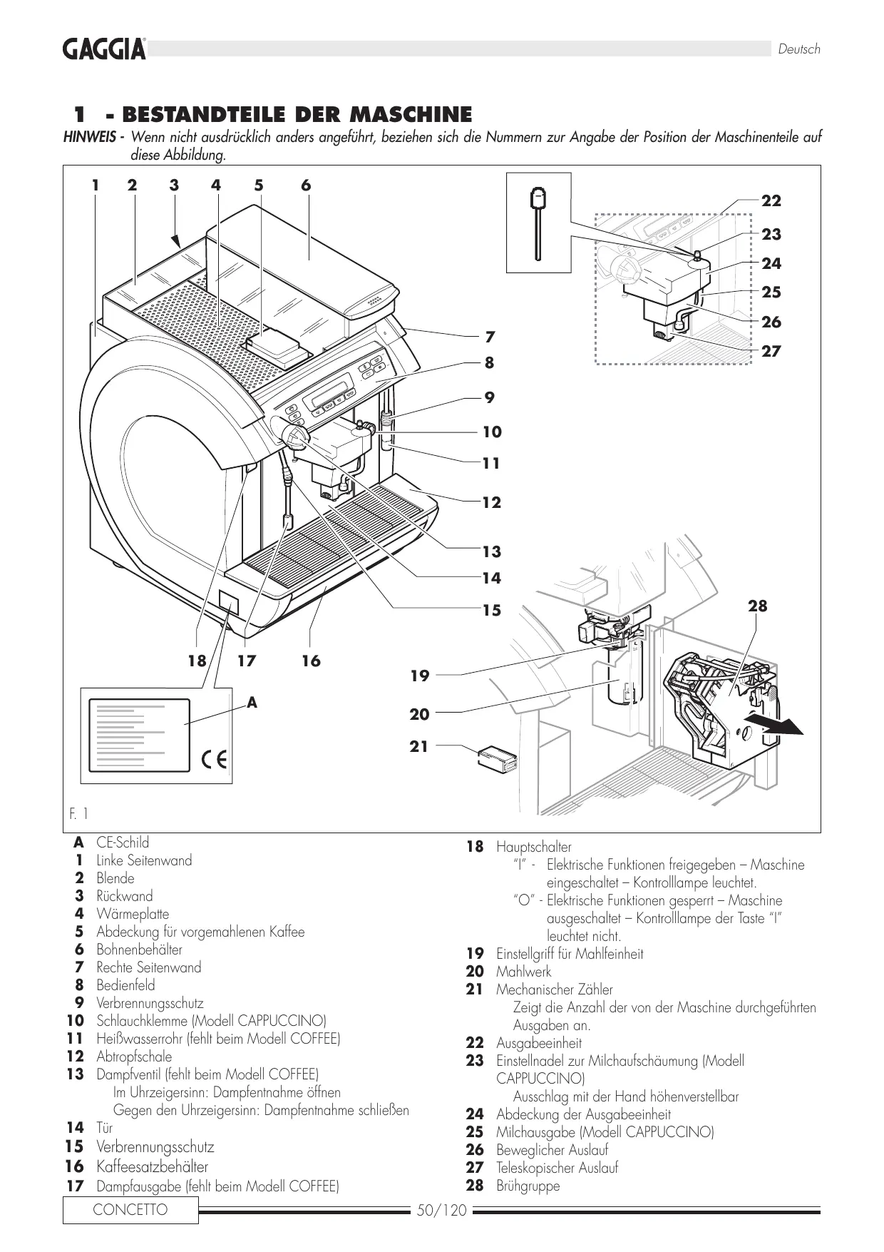 18 Hauptschalter “I” - Elektrische Funktionen freigegeben – Maschine eingeschaltet – Kontrolllampe leuchtet. “O” - Elektrische Funktionen gesperrt – Maschine ausgeschaltet – Kontrolllampe der Taste “I” leuchtet nicht. 19 Einstellgriff für Mahlfeinheit 20 Mahlwerk 21 Mechanischer Zähler Zeigt die Anzahl der von der Maschine durchgeführten Ausgaben an. 22 Ausgabeeinheit 23 Einstellnadel zur Milchaufschäumung (Modell CAPPUCCINO) Ausschlag mit der Hand höhenverstellbar 24 Abdeckung der Ausgabeeinheit 25 Milchausgabe (Modell CAPPUCCINO) 26 Beweglicher Auslauf 27 Teleskopischer Auslauf 28 Brühgruppe 50/120