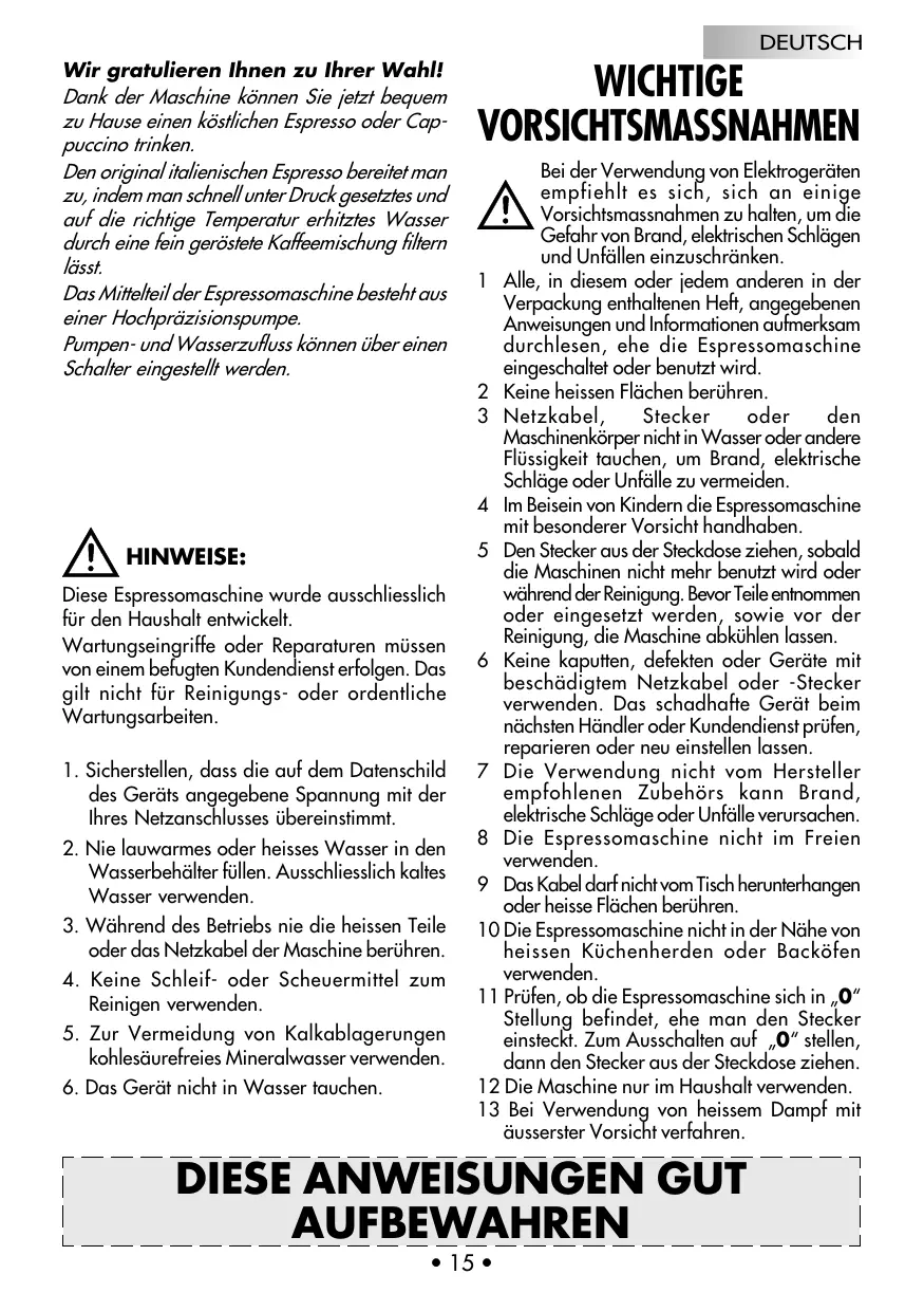 12) et lavez à leau tiède savonneuse. Ne pas utiliser dabrasifs. 5. Nettoyer le joint (15) à lintérieur du groupe percolateur (14). Veiller à ce quelle soit toujours propre. 6 De temps en temps, il faut dévisser le distributeur (16) et le nettoyer. Cela dépendra de la fréquence dutilisation de la machine. 7. Si la machine nest pas utilisée sur une longue période, enlever leau de la chaudière, en positionnant linterrupteur eau chaude/café sur 1 et en faisant sortir de léchappement une quantité deau égale à deux tasses de cappuccino.Remplissez dabord le réservoir avec de leau fraîche. Ne faites jamais marcher la pompe sil ny a pas deau dans la machine. 8 NOTE: Il est tout à fait normal quun peu deau ou de vapeur séchappe de temps en temps dune machine à espresso, car la pression change en cours dutilisation. Noubliez pas de vider la cuvette.