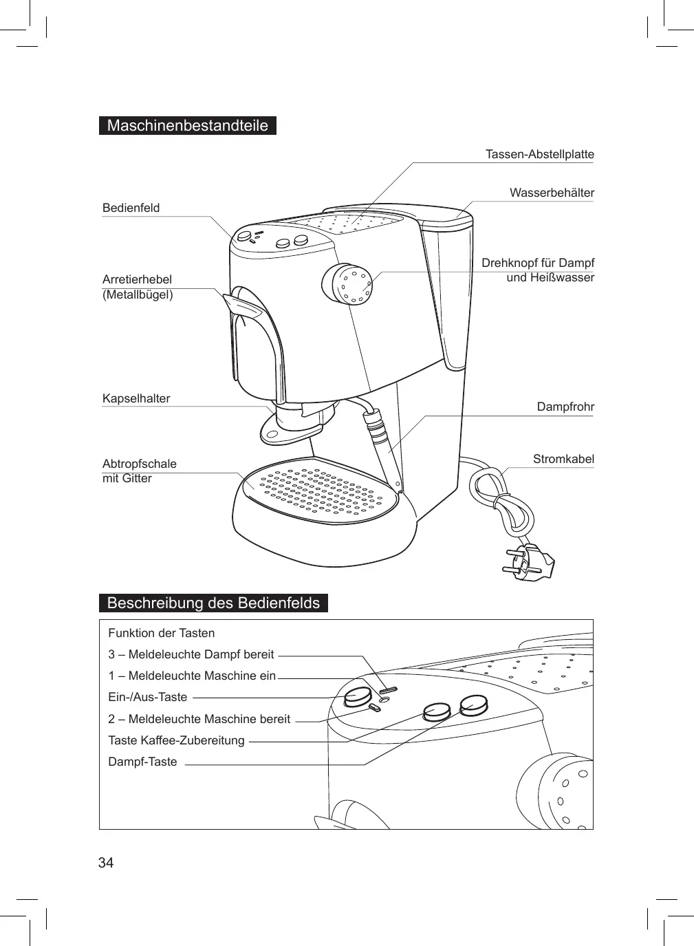 • El vapor o el agua caliente pueden provocar quemaduras. Advertencia – peligro de corte En el interior del porta-cápsulas y en el soporte porta-cápsulas está presente una clavija. Estas dos clavijas perforan la cápsula desde arriba y desde abajo cuando ésta se introduce. En caso de que fuera necesario desplazar la máquina, hay que cogerla por el armazón.