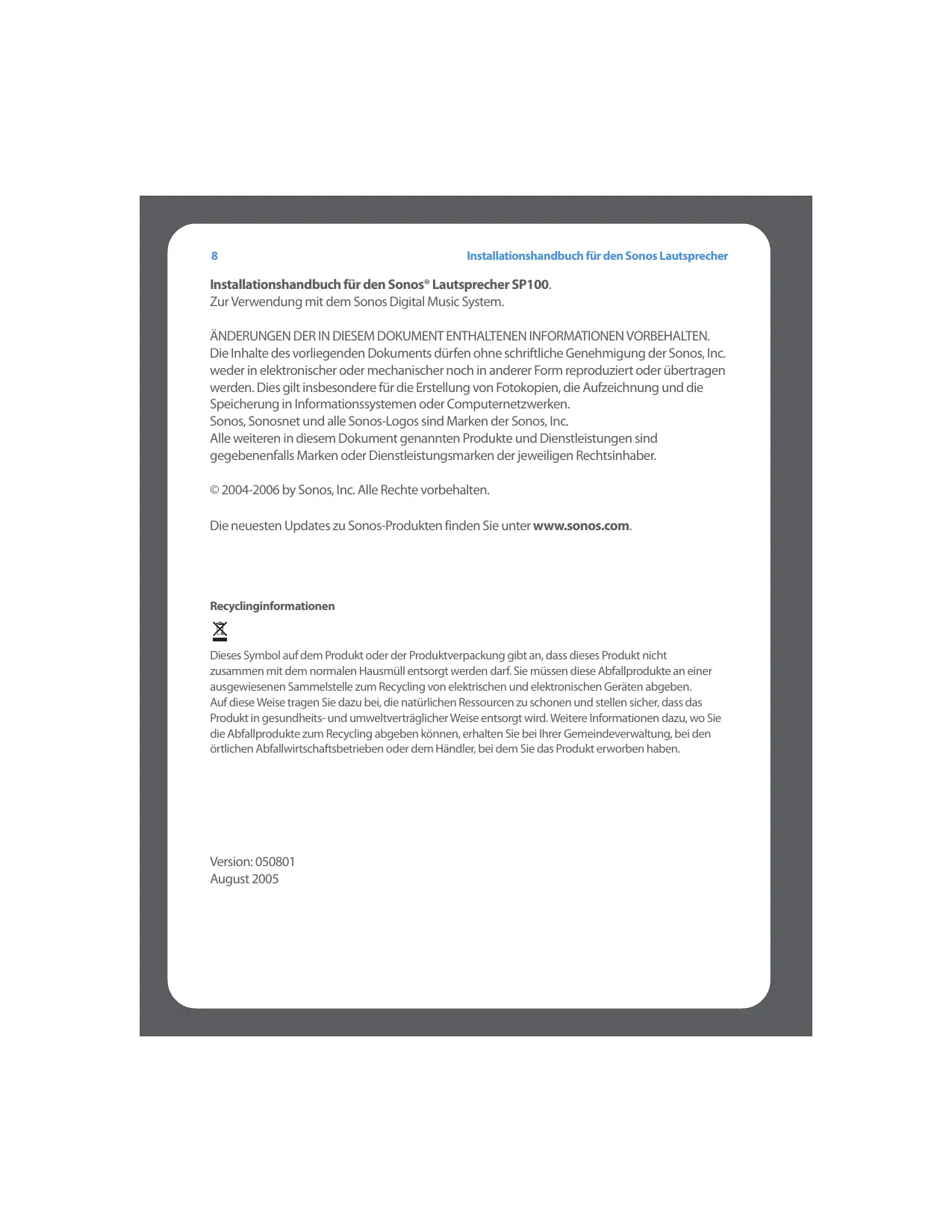 Installationshandbuch für den Sonos Lautsprecher Installationshandbuch für den Sonos® Lautsprecher SP100. Zur Verwendung mit dem Sonos Digital Music System. ÄNDERUNGEN DER IN DIESEM DOKUMENT ENTHALTENEN INFORMATIONEN VORBEHALTEN. Die Inhalte des vorliegenden Dokuments dürfen ohne schriftliche Genehmigung der Sonos, Inc. weder in elektronischer oder mechanischer noch in anderer Form reproduziert oder übertragen werden. Dies gilt insbesondere für die Erstellung von Fotokopien, die Aufzeichnung und die Speicherung in Informationssystemen oder Computernetzwerken. Sonos, Sonosnet und alle Sonos-Logos sind Marken der Sonos, Inc. Alle weiteren in diesem Dokument genannten Produkte und Dienstleistungen sind gegebenenfalls Marken oder Dienstleistungsmarken der jeweiligen Rechtsinhaber. © 2004-2006 by Sonos, Inc. Alle Rechte vorbehalten. Die neuesten Updates zu Sonos-Produkten finden Sie unter www.sonos.com. Recyclinginformationen Dieses Symbol auf dem Produkt oder der Produktverpackung gibt an, dass dieses Produkt nicht zusammen mit dem normalen Hausmüll entsorgt werden darf. Sie müssen diese Abfallprodukte an einer ausgewiesenen Sammelstelle zum Recycling von elektrischen und elektronischen Geräten abgeben. Auf diese Weise tragen Sie dazu bei, die natürlichen Ressourcen zu schonen und stellen sicher, dass das Produkt in gesundheits- und umweltverträglicher Weise entsorgt wird. Weitere Informationen dazu, wo Sie die Abfallprodukte zum Recycling abgeben können, erhalten Sie bei Ihrer Gemeindeverwaltung, bei den örtlichen Abfallwirtschaftsbetrieben oder dem Händler, bei dem Sie das Produkt erworben haben. Version: 050801 August 2005 Installationshandbuch für den Sonos Lautsprecher