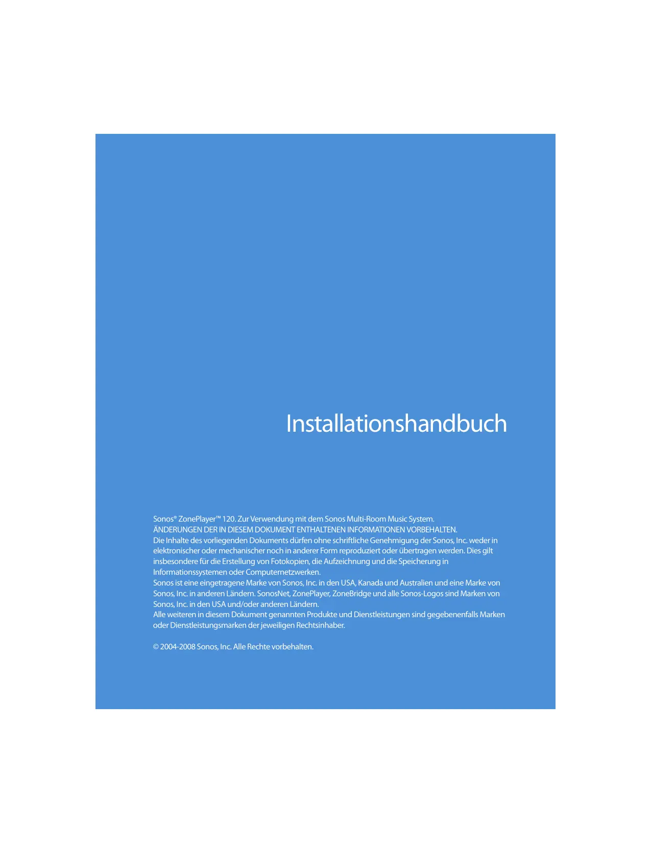 such as vases, on the apparatus. Note: Household cleaners or solvents can damage the finish on your ZonePlayers or Controllers. Clean only with a dry soft cloth. Installationshandbuch Sonos® ZonePlayer™ 120. Zur Verwendung mit dem Sonos Multi-Room Music System. ÄNDERUNGEN DER IN DIESEM DOKUMENT ENTHALTENEN INFORMATIONEN VORBEHALTEN. Die Inhalte des vorliegenden Dokuments dürfen ohne schriftliche Genehmigung der Sonos, Inc. weder in elektronischer oder mechanischer noch in anderer Form reproduziert oder übertragen werden. Dies gilt insbesondere für die Erstellung von Fotokopien, die Aufzeichnung und die Speicherung in Informationssystemen oder Computernetzwerken. Sonos ist eine eingetragene Marke von Sonos, Inc. in den USA, Kanada und Australien und eine Marke von Sonos, Inc. in anderen Ländern. SonosNet, ZonePlayer, ZoneBridge und alle Sonos-Logos sind Marken von Sonos, Inc. in den USA und/oder anderen Ländern. Alle weiteren in diesem Dokument genannten Produkte und Dienstleistungen sind gegebenenfalls Marken oder Dienstleistungsmarken der jeweiligen Rechtsinhaber. © 2004-2008 Sonos, Inc. Alle Rechte vorbehalten.