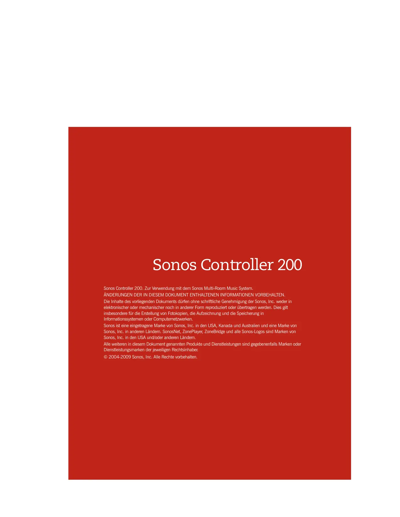 - United Kingdom: 0808 2346596 If your country is not listed here, please visit the Text-Chat and Telephone link (above) to find the correct telephone number for your country. Sonos Controller 200 Sonos Controller 200. Zur Verwendung mit dem Sonos Multi-Room Music System. ÄNDERUNGEN DER IN DIESEM DOKUMENT ENTHALTENEN INFORMATIONEN VORBEHALTEN. Die Inhalte des vorliegenden Dokuments dürfen ohne schriftliche Genehmigung der Sonos, Inc. weder in elektronischer oder mechanischer noch in anderer Form reproduziert oder übertragen werden. Dies gilt insbesondere für die Erstellung von Fotokopien, die Aufzeichnung und die Speicherung in Informationssystemen oder Computernetzwerken. Sonos ist eine eingetragene Marke von Sonos, Inc. in den USA, Kanada und Australien und eine Marke von Sonos, Inc. in anderen Ländern. SonosNet, ZonePlayer, ZoneBridge und alle Sonos-Logos sind Marken von Sonos, Inc. in den USA und/oder anderen Ländern. Alle weiteren in diesem Dokument genannten Produkte und Dienstleistungen sind gegebenenfalls Marken oder Dienstleistungsmarken der jeweiligen Rechtsinhaber. © 2004-2009 Sonos, Inc. Alle Rechte vorbehalten. SVENSKA NEDERLANDS DEUTSCH ENGLISH