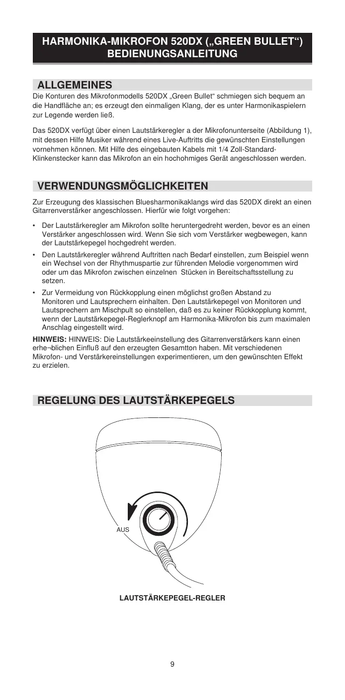 HARMONIKA-MIKROFON 520DX („GREEN BULLET“) BEDIENUNGSANLEITUNG ALLGEMEINES Die Konturen des Mikrofonmodells 520DX „Green Bullet“ schmiegen sich bequem an die Handfläche an; es erzeugt den einmaligen Klang, der es unter Harmonikaspielern zur Legende werden ließ. Das 520DX verfügt über einen Lautstärkeregler a der Mikrofonunterseite (Abbildung 1), mit dessen Hilfe Musiker während eines Live-Auftritts die gewünschten Einstellungen vornehmen können. Mit Hilfe des eingebauten Kabels mit 1/4 Zoll-StandardKlinkenstecker kann das Mikrofon an ein hochohmiges Gerät angeschlossen werden. VERWENDUNGSMÖGLICHKEITEN Zur Erzeugung des klassischen Bluesharmonikaklangs wird das 520DX direkt an einen Gitarrenverstärker angeschlossen. Hierfür wie folgt vorgehen: