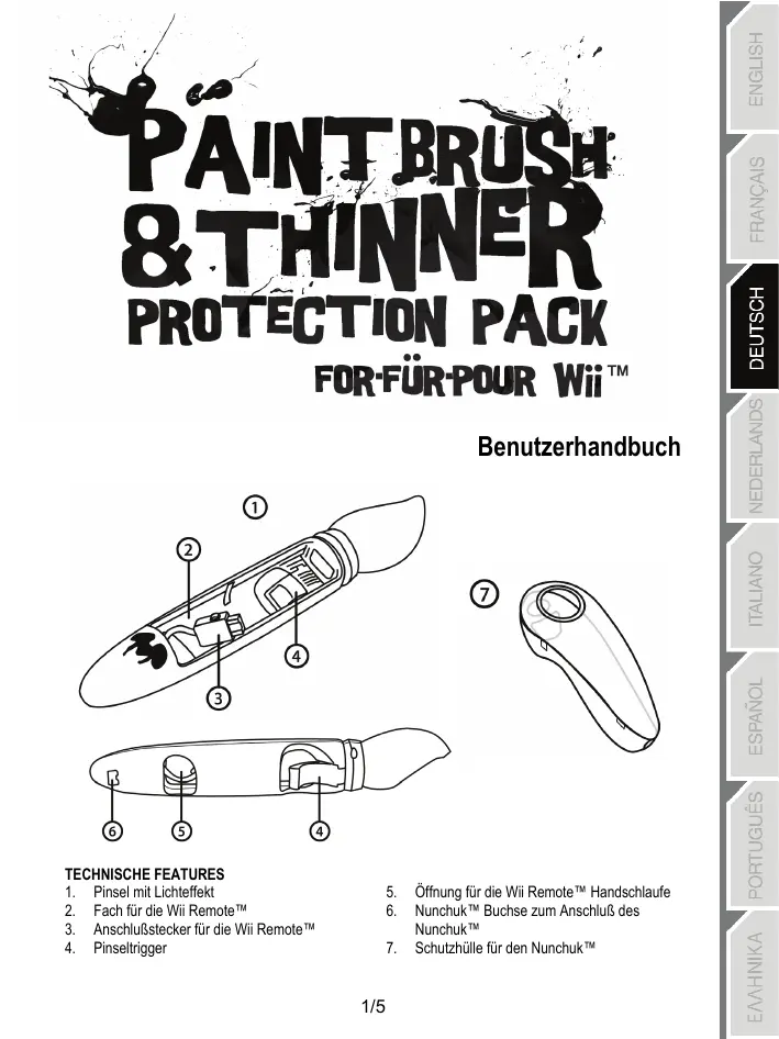 1/5 Öffnung für die Wii Remote™ Handschlaufe Nunchuk™ Buchse zum Anschluß des Nunchuk™ Schutzhülle für den Nunchuk™ EINSETZEN DER WII REMOTE™ IN DEREN FACH Betätigen Sie niemals den Pinseltrigger (4) wenn die Wii Remote™ nicht eingesetzt ist: Sie riskieren andernfalls eine Beschädigung des Produktes. - Schließen Sie die Wii Remote™ an den Anschlußstecker (3) für die Wii Remote an. - Fädeln Sie die Handschlaufe durch die entsprechende Öffnung (5) und setzen die Wii Remote™ in deren Fach (2) ein. - Die “Borsten” an der Spitze des Pinsels, leuchten auf, wenn Sie den Pinseltrigger (4) betätigen. Hinweise: Um den Lichteffekt des Pinsels vollständig genießen zu können, muß die Wii Remote™ mit dem Anschlußstecker (3) verbunden sein. Da der Pinsel durch den Anschlußstecker (3) für die Wii Remote™ mit Strom versorgt wird, sind keine Batterien – außer denen, die für die Funktion der Wii Remote™ selbst benötigt werden – erforderlich. 2/5 MONTIEREN DER SCHUTZHÜLLE UND ANSCHLUSS DES NUNCHUK™ AN DIE WII REMOTE™ - Fügen Sie die beiden Teile der Schutzhülle um den Nunchuk™ zusammen. - Schließen Sie den Nunchuk™ an die Wii Remote™ an indem Sie den Nunchuk™ Stecker in die Nunchuk™ Buchse (6) des Pinsels stecken. Sie können nun mit dem Spielen loslegen! 3/5 TECHNISCHER SUPPORT Sollten Sie mit Ihrem Produkt ein Problem haben, besuchen Sie bitte die Seite http://ts.thrustmaster.com und klicken Sie auf Technischer Support. Von dort aus können Sie auf verschiedene Instrumente zugreifen (Fragen und Antworten (FAQ), die neuesten Versionen von Treibern und Software), die Ihnen bei der Lösung Ihres Problems helfen könnten. Falls das Problem weiterhin besteht, können Sie mit dem technischen Support der Thrustmaster Produkten in Kontakt treten („Technischer Support“): Per E-Mail: Um den Vorzug des technischen Supports per Email in Anspruch nehmen zu können, müssen Sie sich zunächst online registrieren. Mit den Informationen, die Sie uns so zukommen lassen, können die Mitarbeiter Ihr Problem schneller lösen. Klicken Sie auf Registrierung links auf der Seite des technischen Supports und folgen Sie den Instruktionen auf dem Bildschirm. Falls Sie bereits registriert sind, füllen Sie die Textfelder Anwendername und Passwort aus und klicken dann auf Login. Per Telefon (falls Sie über keinen Internetzugang verfügen): Deutschland