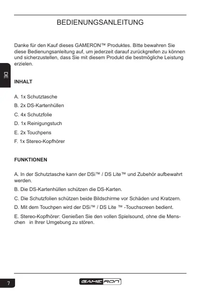 BEDIENUNGSANLEITUNG Danke für den Kauf dieses GAMERON Produktes. Bitte bewahren Sie diese Bedienungsanleïtung auf, um jederzo darau zurückgrelen zu kônnen und sicherzustllen, dass Sie mi diesem Produkt die bestmbglche Leistung erzelen. INHALT À tx Schutztasche E. 2x DS-Karenhüllen C. 4x Schutztoe D. fx Reinigungstuch E. 2x Touchpens F. 1x Stereo-Kophnèrer FUNKTIONEN À in der Schutztasche kann der DSi / DS Lite" und Zubehôr aufbewahrt werden E. Die DS-Kartenhüllen schützen die DS-Kartn. C. Die Schutztaien schützen beide Biléschirme vor Séhäden und Kratzem. D. Mi dem Touchpen wird der DSi" / DS Lite 1 -Touchscraen bedient. E. Siereo-Kophôrer: Genieñian Sie den vollen Spisisound, ohne die Mens chen. in Irer Umgebung zu stéren.