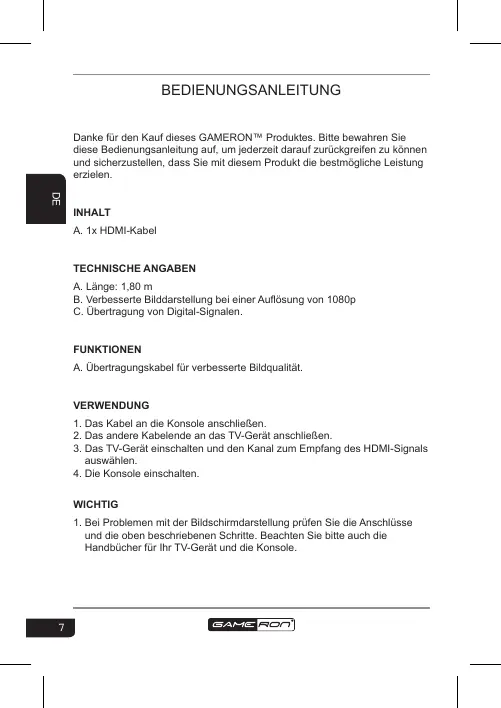BEDIENUNGSANLEITUNG Danke für den Kauf dieses GAMERON™ Produktes. Bitte bewahren Sie diese Bedienungsanleitung auf, um jederzeit darauf zurückgreifen zu können und sicherzustellen, dass Sie mit diesem Produkt die bestmögliche Leistung erzielen. INHALT A. 1x HDMI-Kabel TECHNISCHE ANGABEN A. Länge: 1,80 m B. Verbesserte Bilddarstellung bei einer Auflösung von 1080p C. Übertragung von Digital-Signalen. FUNKTIONEN A. Übertragungskabel für verbesserte Bildqualität. VERWENDUNG