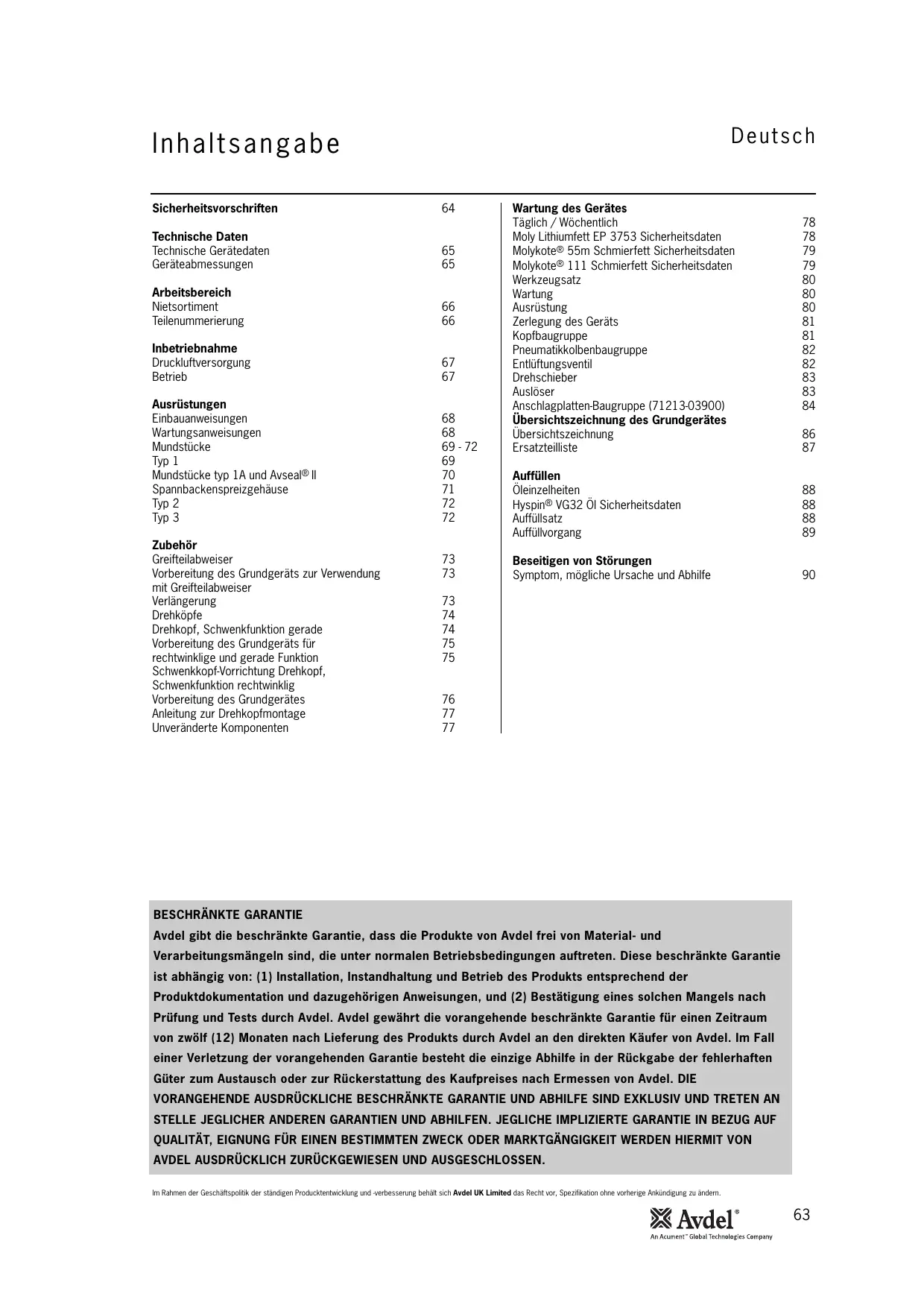 Avdel gibt die beschränkte Garantie, dass die Produkte von Avdel frei von Material- und Verarbeitungsmängeln sind, die unter normalen Betriebsbedingungen auftreten. Diese beschränkte Garantie ist abhängig von: (1) Installation, Instandhaltung und Betrieb des Produkts entsprechend der Produktdokumentation und dazugehörigen Anweisungen, und (2) Bestätigung eines solchen Mangels nach Prüfung und Tests durch Avdel. Avdel gewährt die vorangehende beschränkte Garantie für einen Zeitraum von zwölf (12) Monaten nach Lieferung des Produkts durch Avdel an den direkten Käufer von Avdel. Im Fall einer Verletzung der vorangehenden Garantie besteht die einzige Abhilfe in der Rückgabe der fehlerhaften Güter zum Austausch oder zur Rückerstattung des Kaufpreises nach Ermessen von Avdel. DIE VORANGEHENDE AUSDRÜCKLICHE BESCHRÄNKTE GARANTIE UND ABHILFE SIND EXKLUSIV UND TRETEN AN STELLE JEGLICHER ANDEREN GARANTIEN UND ABHILFEN. JEGLICHE IMPLIZIERTE GARANTIE IN BEZUG AUF QUALITÄT, EIGNUNG FÜR EINEN BESTIMMTEN ZWECK ODER MARKTGÄNGIGKEIT WERDEN HIERMIT VON AVDEL AUSDRÜCKLICH ZURÜCKGEWIESEN UND AUSGESCHLOSSEN. Im Rahmen der Geschäftspolitik der ständigen Producktentwicklung und -verbesserung behält sich Avdel UK Limited das Recht vor, Spezifikation ohne vorherige Ankündigung zu ändern.
