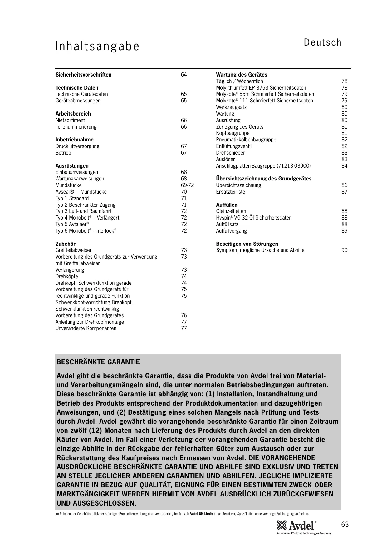 Avdel gibt die beschränkte Garantie, dass die Produkte von Avdel frei von Materialund Verarbeitungsmängeln sind, die unter normalen Betriebsbedingungen auftreten. Diese beschränkte Garantie ist abhängig von: (1) Installation, Instandhaltung und Betrieb des Produkts entsprechend der Produktdokumentation und dazugehörigen Anweisungen, und (2) Bestätigung eines solchen Mangels nach Prüfung und Tests durch Avdel. Avdel gewährt die vorangehende beschränkte Garantie für einen Zeitraum von zwölf (12) Monaten nach Lieferung des Produkts durch Avdel an den direkten Käufer von Avdel. Im Fall einer Verletzung der vorangehenden Garantie besteht die einzige Abhilfe in der Rückgabe der fehlerhaften Güter zum Austausch oder zur Rückerstattung des Kaufpreises nach Ermessen von Avdel. DIE VORANGEHENDE AUSDRÜCKLICHE BESCHRÄNKTE GARANTIE UND ABHILFE SIND EXKLUSIV UND TRETEN AN STELLE JEGLICHER ANDEREN GARANTIEN UND ABHILFEN. JEGLICHE IMPLIZIERTE GARANTIE IN BEZUG AUF QUALITÄT, EIGNUNG FÜR EINEN BESTIMMTEN ZWECK ODER MARKTGÄNGIGKEIT WERDEN HIERMIT VON AVDEL AUSDRÜCKLICH ZURÜCKGEWIESEN UND AUSGESCHLOSSEN. Im Rahmen der Geschäftspolitik der ständigen Producktentwicklung und -verbesserung behält sich Avdel UK Limited das Recht vor, Spezifikation ohne vorherige Ankündigung zu ändern.