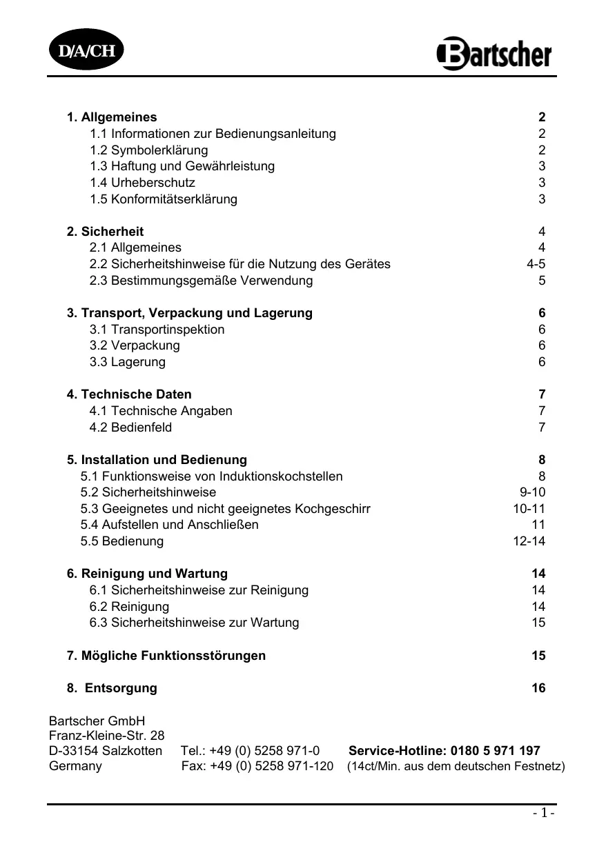 Altgeräte Das ausgediente Gerät ist am Ende seiner Lebensdauer entsprechend den nationalen Bestimmungen zu entsorgen. Es empfiehlt sich, mit einer auf Entsorgung spezialisierten Firma Kontakt aufzunehmen, oder sich mit der Entsorgungsabteilung Ihrer Kommune in Verbindung zu setzen. WARNUNG! Damit der Missbrauch und die damit verbundenen Gefahren ausgeschlossen sind, machen Sie Ihr Altgerät vor der Entsorgung unbrauchbar. Dazu Gerät von der Netzversorgung trennen und das Netzanschlusskabel vom Gerät entfernen. HINWEIS! Für die Entsorgung des Gerätes beachten Sie die in Ihrem Land und in Ihrer Kommune geltenden Vorschriften. Bartscher GmbH Franz-Kleine-Str. 28 D-33154 Salzkotten Germany