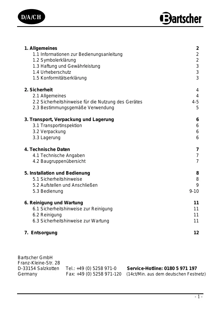 Finden Sie kostenlos die Bedienungsanleitung des Geräts A151.600 BARTSCHER als PDF.