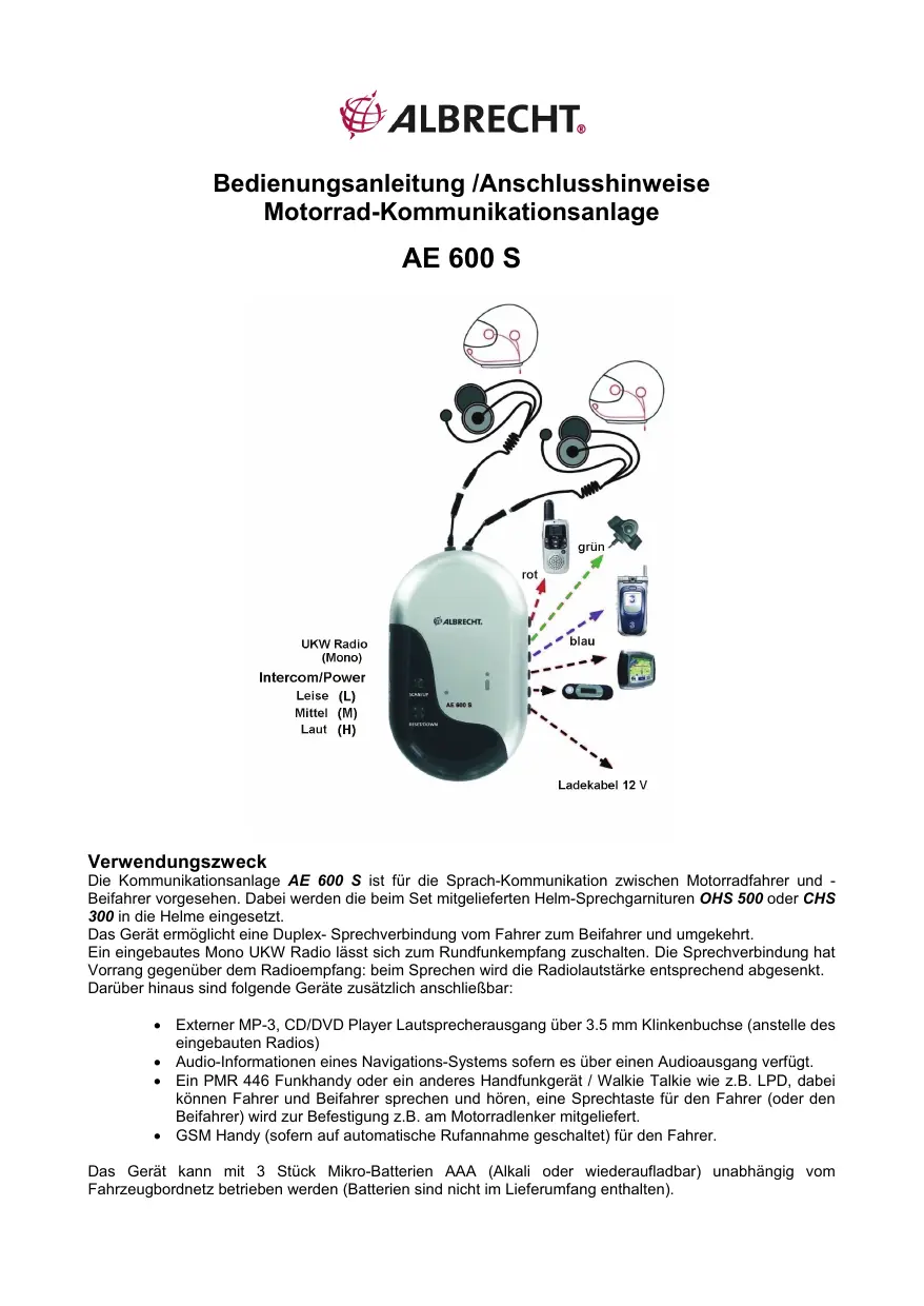 sich bitte im Handy-Zubehör-Fachhandel einen passenden Adapter. Nahezu alle Universal- Freisprechheadsets haben den auch vom AE 600 S benutzen 3.5 mm Stereostecker, daher gibt es Adapter für viele gängige Handymodelle. Programmieren Sie das Handy auf automatische Rufannahme. Einen eingehenden Anruf hören Sie dann in beiden Kopfhörern. Wie auch beim Funk, haben eingehende Anrufe Vorrang vor Radio und CD / MP 3 Player. Beantworten können Sie den Anruf über das Fahrermikrofon. Sprechen Sie dabei bitte mindestens so laut, wie es der Schalterstellung entspricht. Die richtige Lautstärke haben Sie dann erreicht, wenn der Radioempfang beim Sprechen gerade leise wird. Drücken Sie bitte beim Telefonieren keineswegs die Sprechtaste, denn das würde Ihre Antwort unmittelbar an das Funkgerät anstelle des Handy’s leiten! Entsorgen des Geräts Nach den neuen EU Richtlinien dürfen defekte oder nicht mehr benötigte elektronische Geräte nicht mit dem normalen Hausmüll entsorgt werden, sondern können bei den kommunalen Sammelstellen abgegeben werden. Das Symbol auf dem Gerät weist darauf hin. Bevor Sie ein Gerät entsorgen, entnehmen Sie bitte die Batterien und geben diese getrennt bei den Alt-Batterie-Sammelstellen ab. © 2008 Alan Electronics GmbH www.alan-electronics.de / www.albrecht-online.de Service: service@alan-electronics.de, Reparaturen und Ersatzteile: 06103 9481-22 Technische Beratungs-Hotline: 0900 1234 222 (0.69 Euro/Minute aus dem deutschen Festnetz, 1.49 Euro/Min aus deutschen Mobilfunknetzen) , Fax 06103-9481-60 Service-Download: www.hobbyradio.de, www.alan-albrecht.info Operating manual / Hints for connection Motorbike communication system AE 600 S Purpose for use The communication system AE 600 S has been designed for speech communication between motorbike driver and passenger. To achieve this you use the supplied helmet speaker sets OHS 500 which have to be fitted into already existing closed or open helmets (the microphone with it’s thin and flexible boom can be installed at both kinds of helmets). As optional solution, also a version with velcro-type microphone (CHS300), only for closed helmets, is available. The set gives you the opportunity for duplex communication between driver and passenger and vice versa. The integrated Mono FM radio can be switched over to radio reception. The talking connection has priority to radio reception: while talking the radio volume will be automatically decreased. Furthermore the following equipment can be connected: