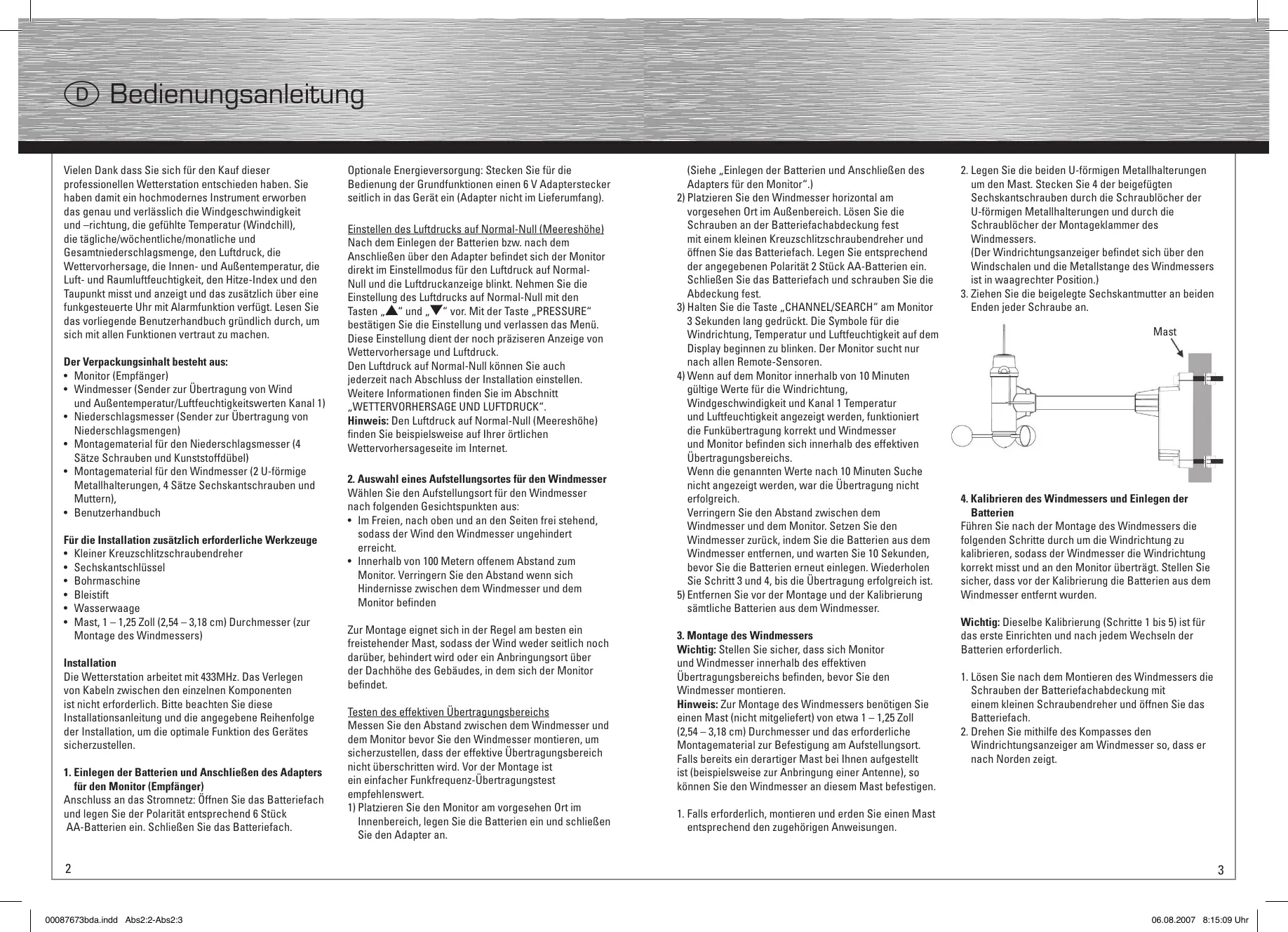 -richting, guurfactor (gevoelstemperatuur), dagelijks/ wekelijks/maandelijkse hoeveelheid regen, luchtdruk, weersvoorspelling, relatieve luchtvochtigheid binnen/ buiten, temperatuur, heat (opwarm) index en dauwpunt en tevens een radiogestuurde klok voorzien van alarmfunctie. Lees deze handleiding zorgvuldig door om alle kenmerken en functies van het nieuwe product te leren kennen. U treft in deze verpakking de volgende onderdelen aan: Belangrijk: Vergewis u ervan dat de onderlinge afstand tussen de monitor en de anemometer binnen het mogelijke zendbereik ligt voordat de anemometer wordt gemonteerd. Opmerking: Teneinde de anemometer te kunnen monteren heeft u een (niet meegeleverde) mast nodig, met een diameter van ongeveer 1” – 1,25” (2,54 cm – 3,18 cm). Tevens heeft u montagemateriaal nodig om de mast op de plaats van bestemming te kunnen bevestigen. Als u reeds over een dergelijke mast beschikt (voor een antenne bijvoorbeeld) dan kunt u eventueel deze mast gebruiken om de anemometer te bevestigen. 1. Indien van toepassing, monteer de mast volgens de instructies van de mastleverancier en vergeet niet deze te aarden. 2. Plaats de meegeleverde kapbeugels om de mast. Steek de 4 meegeleverde bouten (type Hex) door de gaten van de kapbeugels en door de gaten in de montagebeugel van de anemometer. (De windvaan bevindt zich boven de windschoteltjes en de metalen staaf van de anemometer is in horizontale positie) 3. Draai de moeren (type Hex) op iedere bout vast.