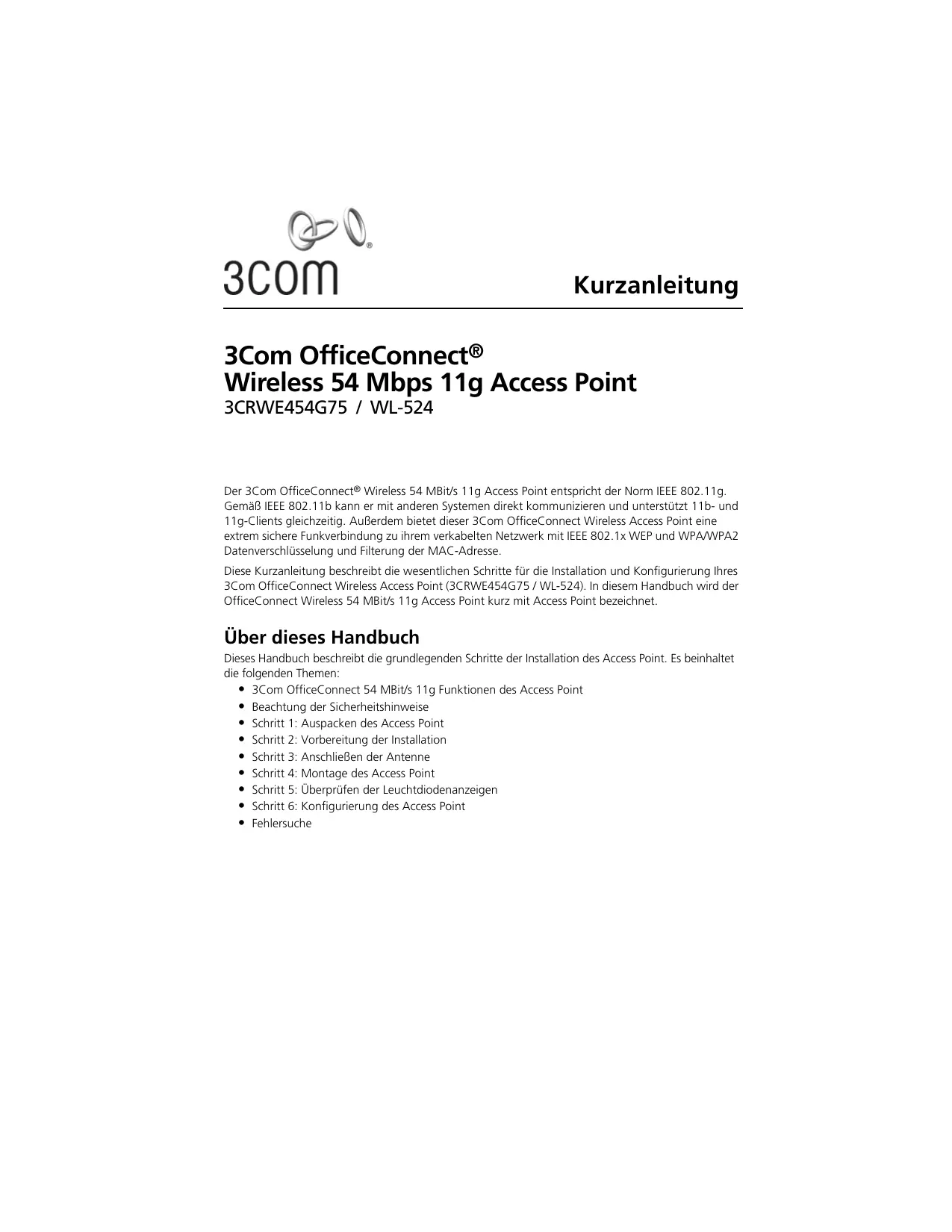 Laden Sie die Anleitung für Ihr Drahtloser Zugangspunkt kostenlos im PDF-Format! Finden Sie Ihr Handbuch OFFICECONNECT WL-524 - 3COM und nehmen Sie Ihr elektronisches Gerät wieder in die Hand. Auf dieser Seite sind alle Dokumente veröffentlicht, die für die Verwendung Ihres Geräts notwendig sind. OFFICECONNECT WL-524 von der Marke 3COM.