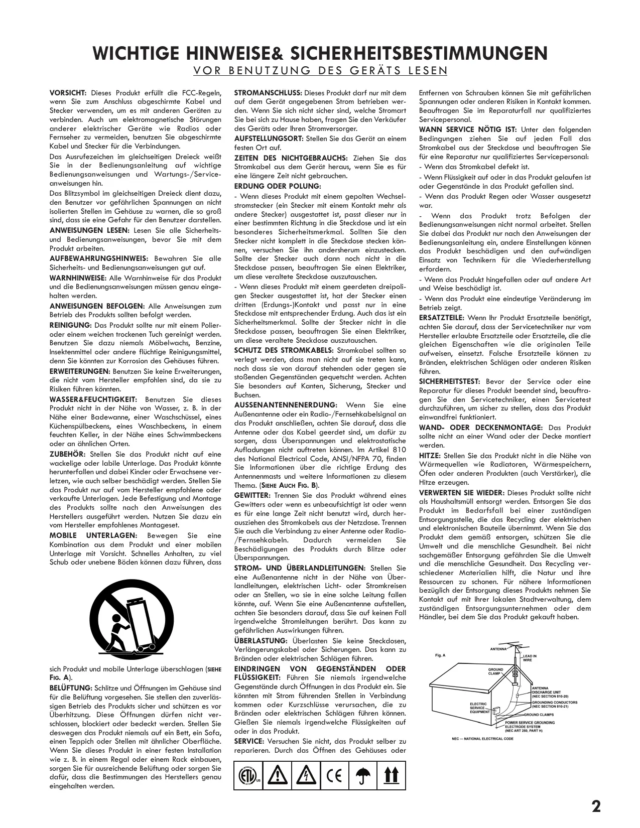 VO R B E N U T Z U N G D E S G E R ÄT S L E S E N VORSICHT: Dieses Produkt erfüllt die FCC-Regeln, wenn Sie zum Anschluss abgeschirmte Kabel und Stecker verwenden, um es mit anderen Geräten zu verbinden. Auch um elektromagnetische Störungen anderer elektrischer Geräte wie Radios oder Fernseher zu vermeiden, benutzen Sie abgeschirmte Kabel und Stecker für die Verbindungen. Das Ausrufezeichen im gleichseitigen Dreieck weißt Sie in der Bedienungsanleitung auf wichtige Bedienungsanweisungen und Wartungs-/Serviceanweisungen hin. Das Blitzsymbol im gleichseitigen Dreieck dient dazu, den Benutzer vor gefährlichen Spannungen an nicht isolierten Stellen im Gehäuse zu warnen, die so groß sind, dass sie eine Gefahr für den Benutzer darstellen. ANWEISUNGEN LESEN: Lesen Sie alle Sicherheitsund Bedienungsanweisungen, bevor Sie mit dem Produkt arbeiten. AUFBEWAHRUNGSHINWEIS: Bewahren Sie alle Sicherheits- und Bedienungsanweisungen gut auf. WARNHINWEISE: Alle Warnhinweise für das Produkt und die Bedienungsanweisungen müssen genau eingehalten werden. ANWEISUNGEN BEFOLGEN: Alle Anweisungen zum Betrieb des Produkts sollten befolgt werden. REINIGUNG: Das Produkt sollte nur mit einem Polieroder einem weichen trockenen Tuch gereinigt werden. Benutzen Sie dazu niemals Möbelwachs, Benzine, Insektenmittel oder andere flüchtige Reinigungsmittel, denn Sie könnten zur Korrosion des Gehäuses führen. ERWEITERUNGEN: Benutzen Sie keine Erweiterungen, die nicht vom Hersteller empfohlen sind, da sie zu Risiken führen könnten. WASSER&FEUCHTIGKEIT: Benutzen Sie dieses Produkt nicht in der Nähe von Wasser, z. B. in der Nähe einer Badewanne, einer Waschschüssel, eines Küchenspülbeckens, eines Waschbeckens, in einem feuchten Keller, in der Nähe eines Schwimmbeckens oder an ähnlichen Orten. ZUBEHÖR: Stellen Sie das Produkt nicht auf eine wackelige oder labile Unterlage. Das Produkt könnte herunterfallen und dabei Kinder oder Erwachsene verletzen, wie auch selber beschädigt werden. Stellen Sie das Produkt nur auf vom Hersteller empfohlene oder verkaufte Unterlagen. Jede Befestigung und Montage des Produkts sollte nach den Anweisungen des Herstellers ausgeführt werden. Nutzen Sie dazu ein vom Hersteller empfohlenes Montageset. MOBILE UNTERLAGEN: Bewegen Sie eine Kombination aus dem Produkt und einer mobilen Unterlage mit Vorsicht. Schnelles Anhalten, zu viel Schub oder unebene Böden können dazu führen, dass sich Produkt und mobile Unterlage überschlagen (SIEHE FIG. A). BELÜFTUNG: Schlitze und Öffnungen im Gehäuse sind für die Belüftung vorgesehen. Sie stellen den zuverlässigen Betrieb des Produkts sicher und schützen es vor Überhitzung. Diese Öffnungen dürfen nicht verschlossen, blockiert oder bedeckt werden. Stellen Sie deswegen das Produkt niemals auf ein Bett, ein Sofa, einen Teppich oder Stellen mit ähnlicher Oberfläche. Wenn Sie dieses Produkt in einer festen Installation wie z. B. in einem Regal oder einem Rack einbauen, sorgen Sie für ausreichende Belüftung oder sorgen Sie dafür, dass die Bestimmungen des Herstellers genau eingehalten werden. STROMANSCHLUSS: Dieses Produkt darf nur mit dem auf dem Gerät angegebenen Strom betrieben werden. Wenn Sie sich nicht sicher sind, welche Stromart Sie bei sich zu Hause haben, fragen Sie den Verkäufer des Geräts oder Ihren Stromversorger. AUFSTELLUNGSORT: Stellen Sie das Gerät an einem festen Ort auf. ZEITEN DES NICHTGEBRAUCHS: Ziehen Sie das Stromkabel aus dem Gerät heraus, wenn Sie es für eine längere Zeit nicht gebrauchen. ERDUNG ODER POLUNG: - Wenn dieses Produkt mit einem gepolten Wechselstromstecker (ein Stecker mit einem Kontakt mehr als andere Stecker) ausgestattet ist, passt dieser nur in einer bestimmten Richtung in die Steckdose und ist ein besonderes Sicherheitsmerkmal. Sollten Sie den Stecker nicht komplett in die Steckdose stecken können, versuchen Sie ihn andersherum einzustecken. Sollte der Stecker auch dann noch nicht in die Steckdose passen, beauftragen Sie einen Elektriker, um diese veraltete Steckdose auszutauschen. - Wenn dieses Produkt mit einem geerdeten dreipoligen Stecker ausgestattet ist, hat der Stecker einen dritten (Erdungs-)Kontakt und passt nur in eine Steckdose mit entsprechender Erdung. Auch das ist ein Sicherheitsmerkmal. Sollte der Stecker nicht in die Steckdose passen, beauftragen Sie einen Elektriker, um diese veraltete Steckdose auszutauschen. SCHUTZ DES STROMKABELS: Stromkabel sollten so verlegt werden, dass man nicht auf sie treten kann, noch dass sie von darauf stehenden oder gegen sie stoßenden Gegenständen gequetscht werden. Achten Sie besonders auf Kanten, Sicherung, Stecker und Buchsen. AUSSENANTENNENERDUNG: Wenn Sie eine Außenantenne oder ein Radio-/Fernsehkabelsignal an das Produkt anschließen, achten Sie darauf, dass die Antenne oder das Kabel geerdet sind, um dafür zu sorgen, dass Überspannungen und elektrostatische Aufladungen nicht auftreten können. Im Artikel 810 des National Electrical Code, ANSI/NFPA 70, finden Sie Informationen über die richtige Erdung des Antennenmasts und weitere Informationen zu diesem Thema. (SIEHE AUCH FIG. B). GEWITTER: Trennen Sie das Produkt während eines Gewitters oder wenn es unbeaufsichtigt ist oder wenn es für eine lange Zeit nicht benutzt wird, durch herausziehen des Stromkabels aus der Netzdose. Trennen Sie auch die Verbindung zu einer Antenne oder Radio/Fernsehkabeln. Dadurch vermeiden Sie Beschädigungen des Produkts durch Blitze oder Überspannungen. STROM- UND ÜBERLANDLEITUNGEN: Stellen Sie eine Außenantenne nicht in der Nähe von Überlandleitungen, elektrischen Licht- oder Stromkreisen oder an Stellen, wo sie in eine solche Leitung fallen könnte, auf. Wenn Sie eine Außenantenne aufstellen, achten Sie besonders darauf, dass Sie auf keinen Fall irgendwelche Stromleitungen berührt. Das kann zu gefährlichen Auswirkungen führen. ÜBERLASTUNG: Überlasten Sie keine Steckdosen, Verlängerungskabel oder Sicherungen. Das kann zu