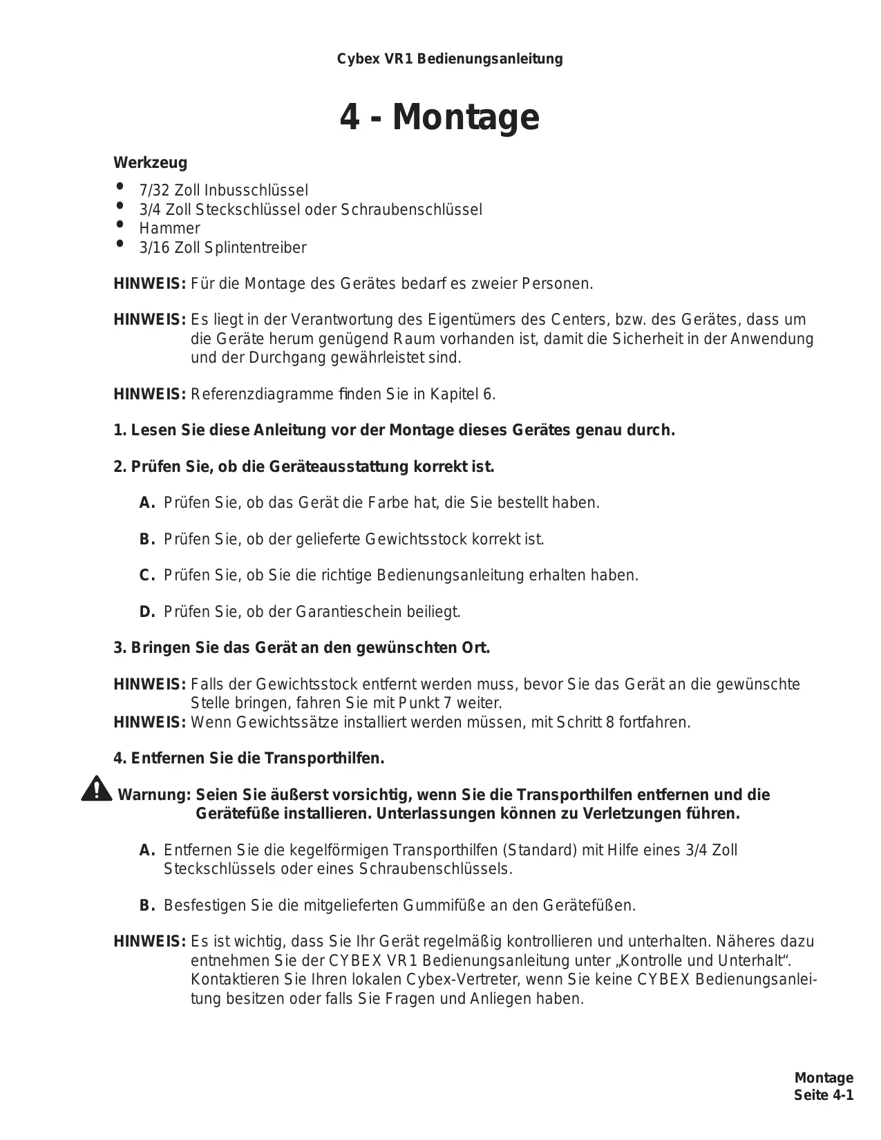 HINWEIS: Es ist wichtig, dass Sie Ihr Gerät regelmäßig kontrollieren und unterhalten. Nähres dazu entnahmen Sie der CYBEX VR1 Bedienungsanleitung unter „Kontrolle und Unterhalt". Kontaktieren Sie ihren lokalen Cybex-Vertreter, wenn Sie keine CYBEX Bedienungsanleitung besitzen oder falls Sie Fragen und Anliegen haben.